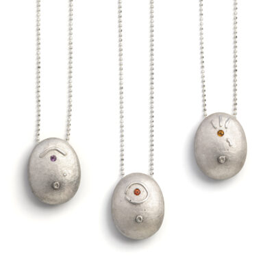 Cyclopes eye silver 925, hammered pebble pendants with three different semiprecious stone options on 45cm silver chain. Stones: Amethyst & orange sapphire. By Margarita Malliri.
