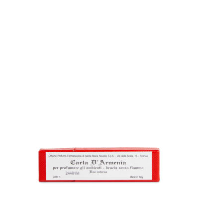 Officina Profumo-Farmaceutica di Santa Maria Novella’s Carta d’Armenia is paper soaked in a mixture of infusions of resins and oriental spices. It burns without flame and the vapor purifies the air and scents interiors. It may also be used to perfume clothing by placing it intact in drawers or closets.