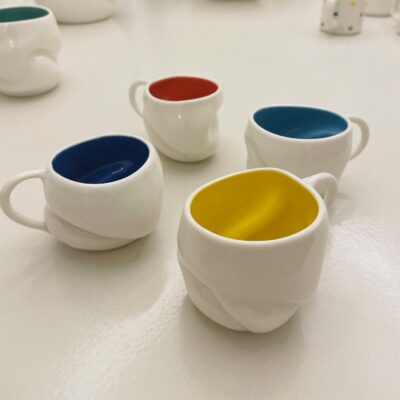 Coffee Cup/ made of white porcelain with different colors from the collection “Intimacy in Transition” by Aris Galstyan, Dimensions: 6cm x 5,5cm. Usable and washable in the dishwasher.