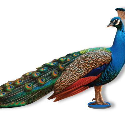 Peacock figure made of printed aluminium on a round base, dimensions: 39 x 24 cm, base perimeter :5cm