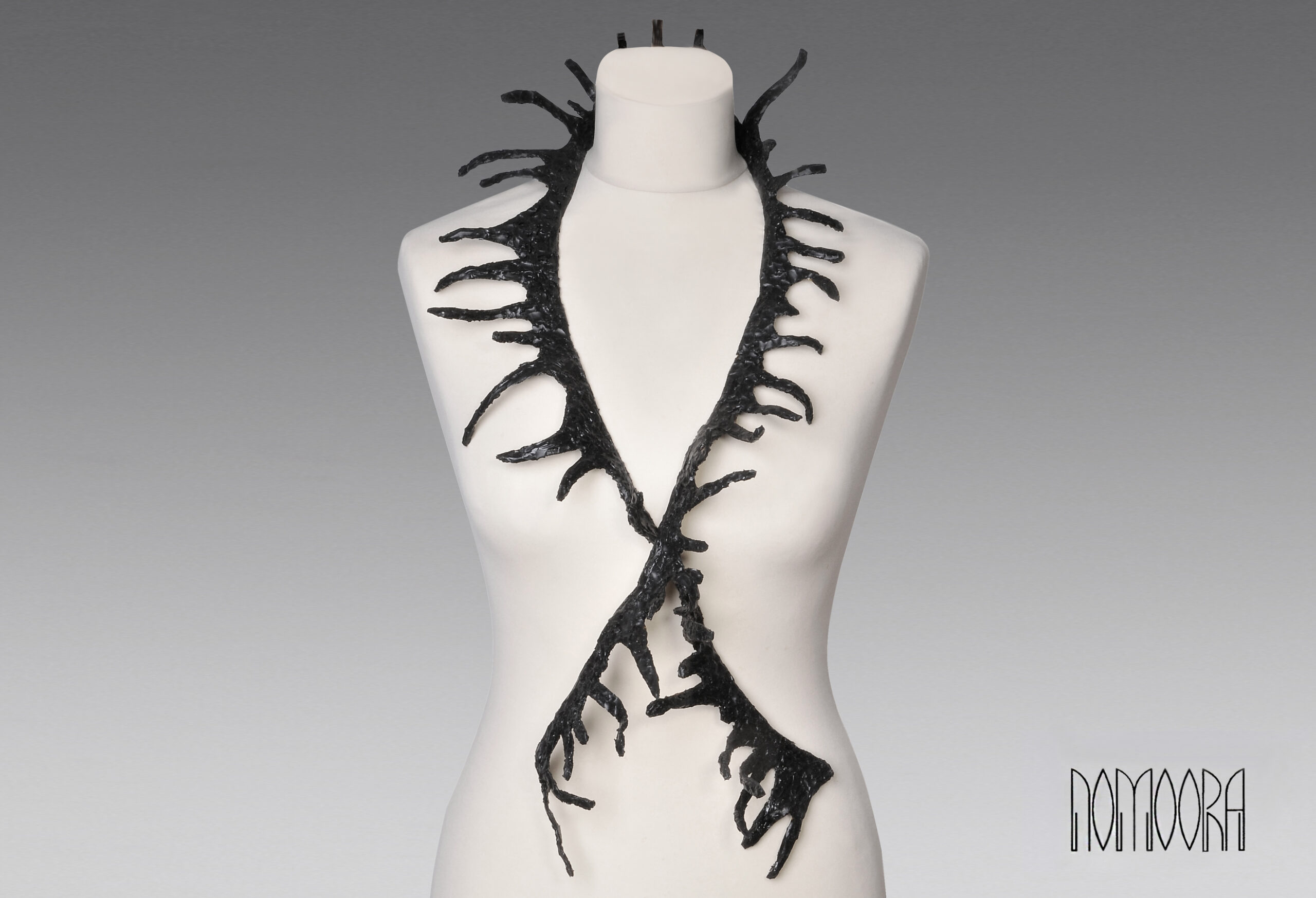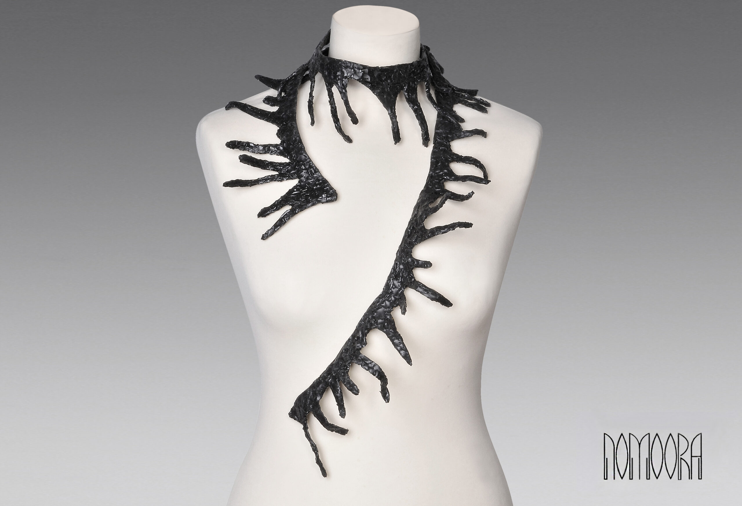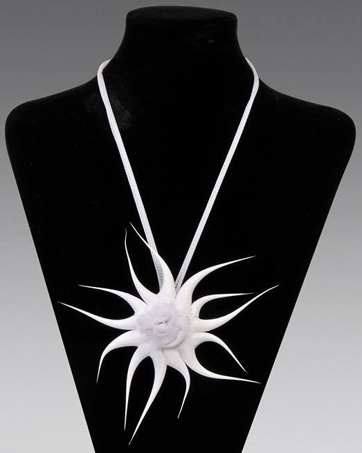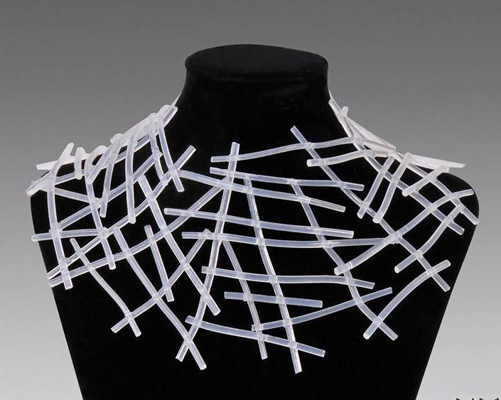 Necklaces and bracelets from silicone sometimes oversized and sometimes free in their forms and colors. They embrace the body and become one with the person who carries them. The jewelry collection is accompanied by large silicone sculptures that are unfolding in gallery space and offer a new experience of this unpredictable and multifaceted material.