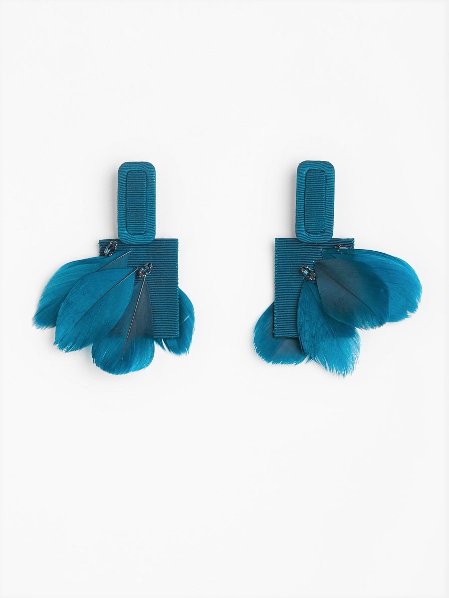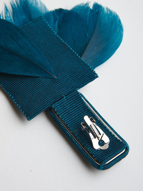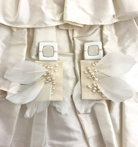 Her last collection is composed of clasps covered in grosgrain ribbon, baroque pearls, grey crystals and silky goose feathers. The balance between the ferocity of nature and the human need for idealization, beauty and glamour is explored. Shapes and materials reflect this contrast between natural and man-made, creating jewelry that befit contemporary, urban everyday life.