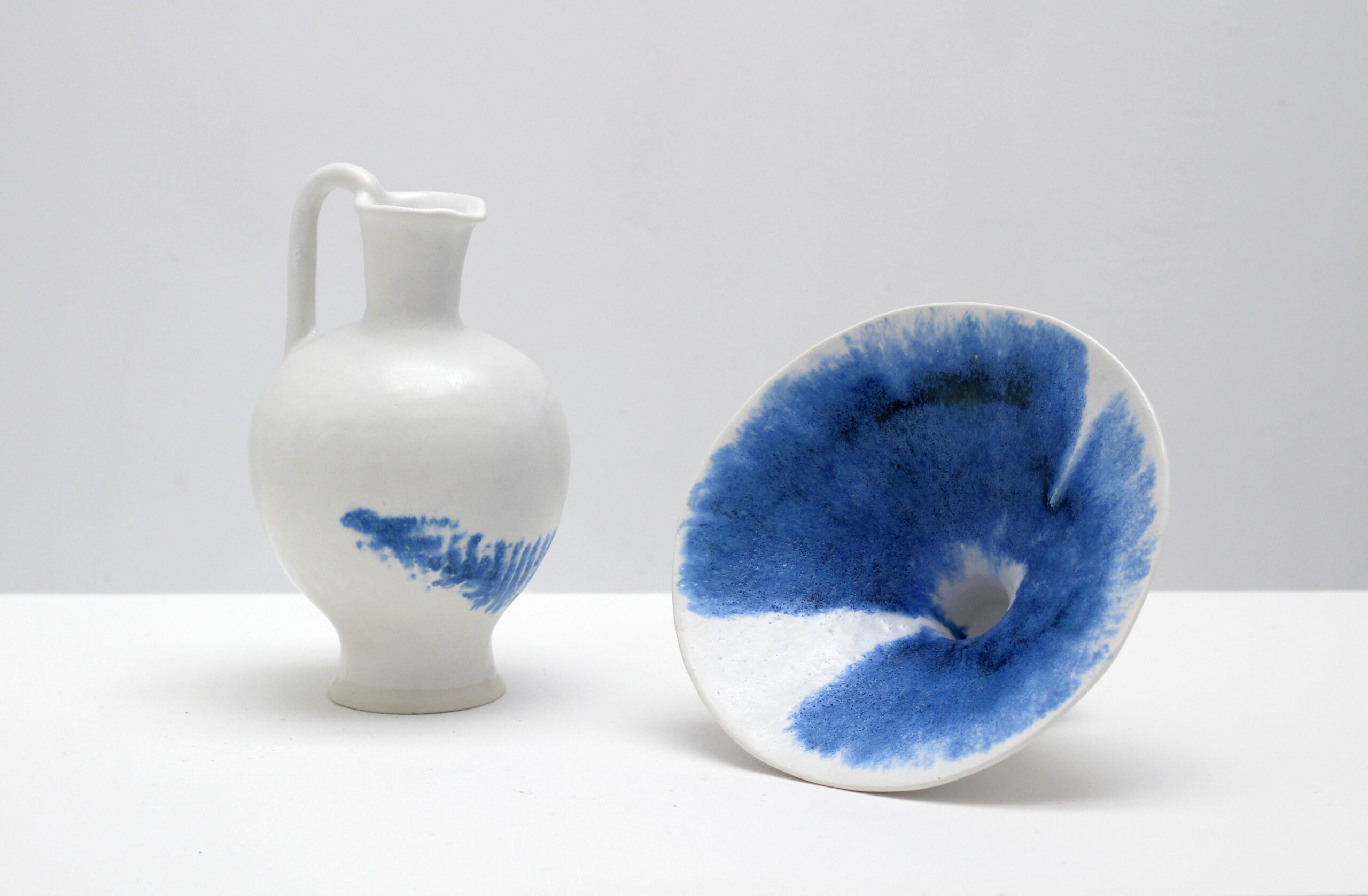 Melina Xenaki graduated from the Royal College of Art in 2014. Working from her studio in East London, the maker focuses on perfecting her practice, experimenting with different ceramic materials in search of original and striking effects. She aims to share her love for the raw and authentic beauty of the traditional villages of the Greek islands scattered in the Aegean Sea. Drawing inspiration from the beautiful architectural elements of the Cyclades, Melina turns the whitewashed facades, the endless blue of the sky and the sea into unique objects for the home. Passionate about texture and variation in her glazes, Melina mixes all her materials from scratch, looking to imitate the surface features of paper and the expressive, harmonious, and skillful qualities of calligraphy, meaning beautiful writing in greek.