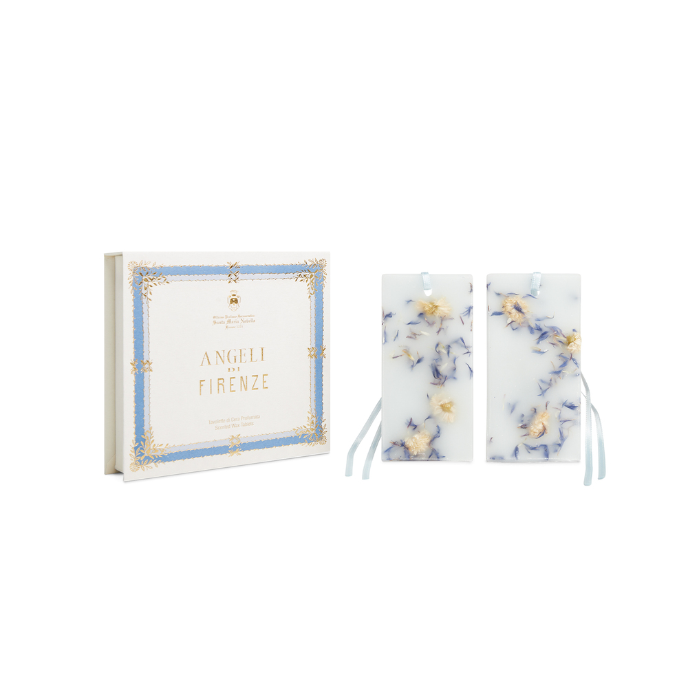 Τα μπλε πέταλα αραβοσίτου και τα άνθη χαμομηλιού εμπλουτίζουν τις κέρινες ταμπλέτες της Officina, ένα φόρο τιμής στη φύση και τους πιο πολύτιμους καρπούς της. Κάθε συσκευασία περιέχει δύο ταμπλέτες εμπλουτισμένες με το άρωμα εμπνευσμένο από το Angeli di Firenze Eau de Cologne, με νότες θάλασσας, πορτοκαλιού και γιασεμιού, έτοιμα να αρωματίσουν τα συρτάρια και τις ντουλάπες σας.
