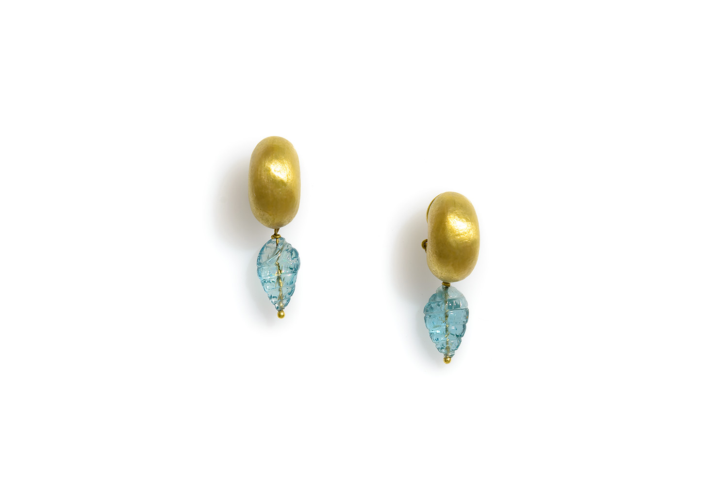 Xρυσά σκουλαρίκια 18 καρατίων με σφυρήλατη επιφάνεια και μοναδικές aquamarines σε σχήμα κοχυλιού. Χρυσό 18κ χειροποιήτο κούμπωμα. Μοναδικό κομμάτι. Μήκος : 3,5cm.