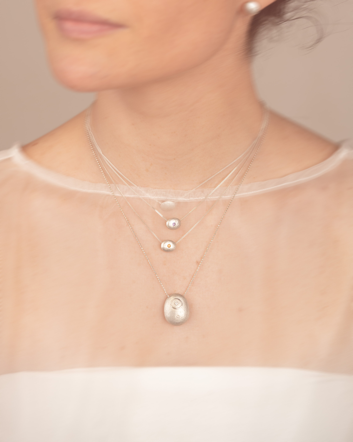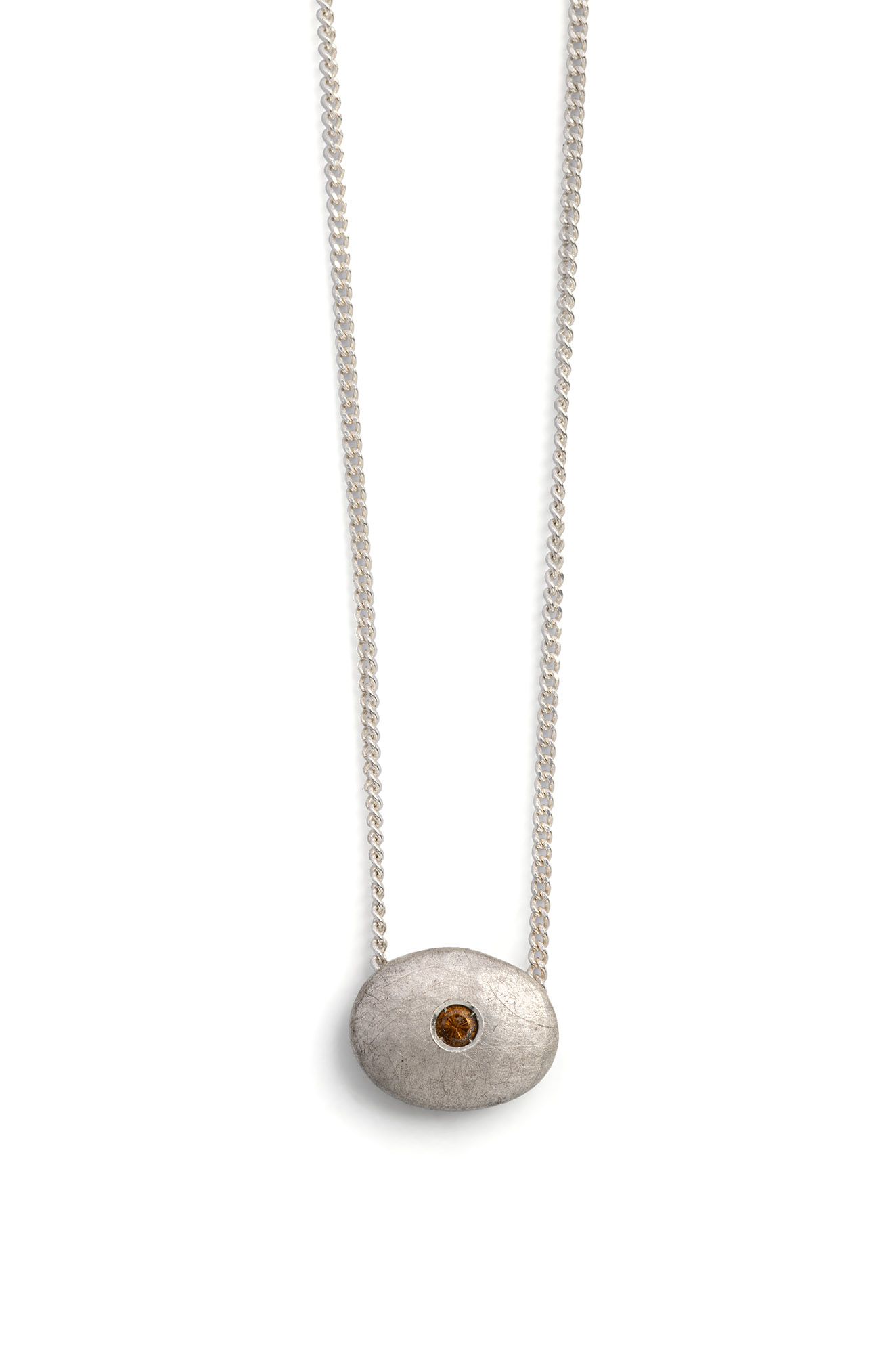 Ασημένιο, σφυρήλατο μενταγιόν βότσαλο με μπλέ τοπάζι σε ασημένια αλυσίδα 38 εκ. Διαθέσιμο επίσης με citrine. Από την Margarita Malliri.