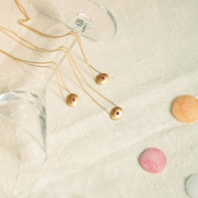 Ασημένιο επιχρυσωμένο, σφυρήλατο μενταγιόν βότσαλο με ροδολίτη, σε ασημένια επιχρυσωμένη αλυσίδα 38 εκ. Διατίθεται επίσης με λευκό ζιργκόν. Από την Margarita Malliri.