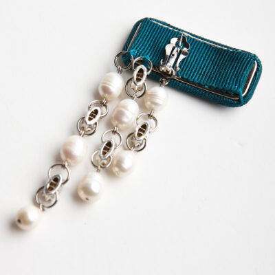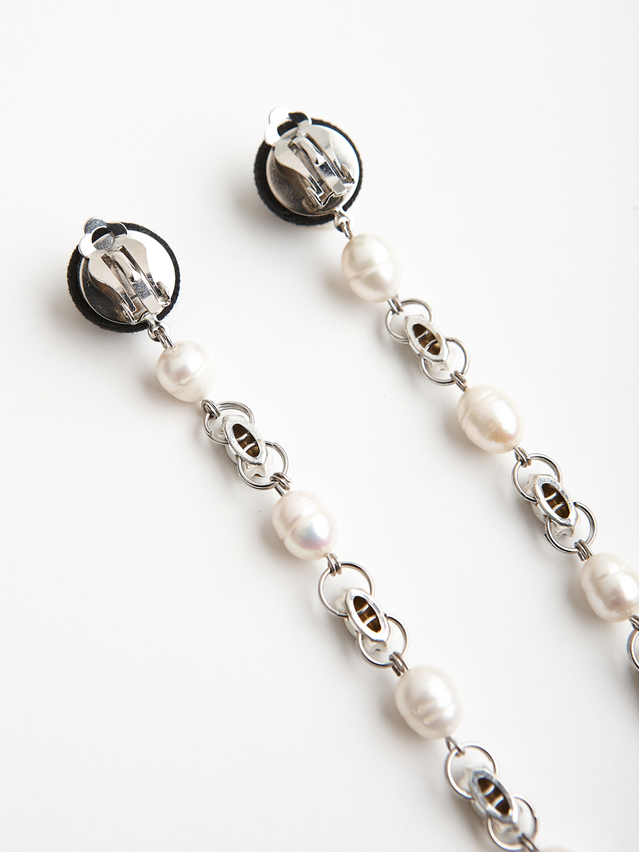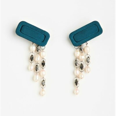 Σκουλαρίκια σε μαύρο χρώμα που αποτελούνται από ένα κουμπί καλυμμένο με γκρο κορδέλα και αλυσίδα από μαργαριτάρια γλυκού νερού και γκρίζους κρυστάλλους Swarovski