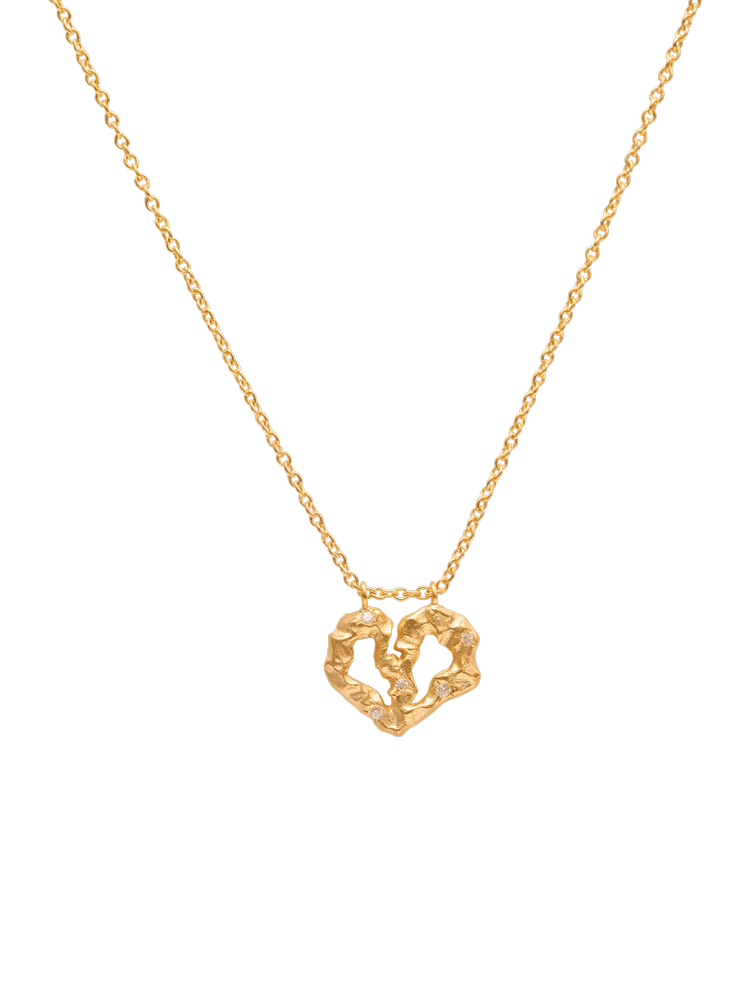 The broken heart necklace, celebrates the power and courage to not share your heart in a sense that our culture has placed upon us. Choosing a new way to split it in two, so as to devote each its piece any way you desire, on the journey being oneself. Additionally, this piece is created to support the ones who chose to keep their hearts to themselves.