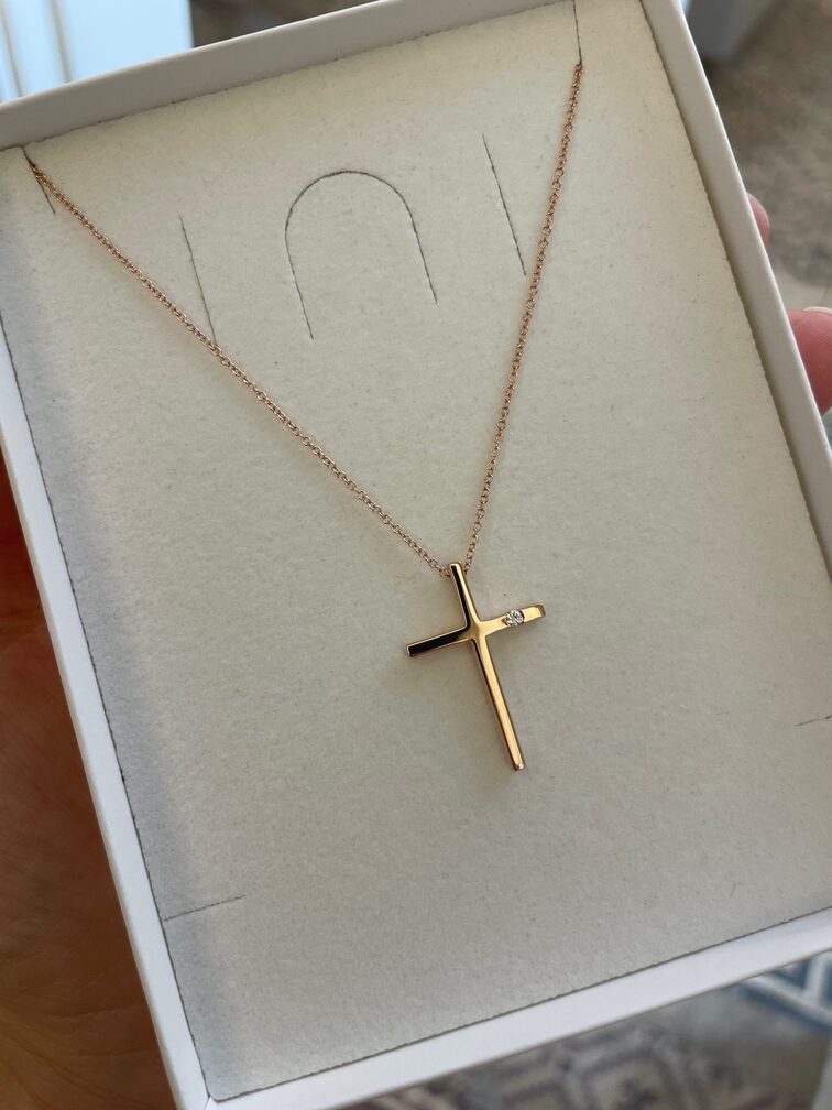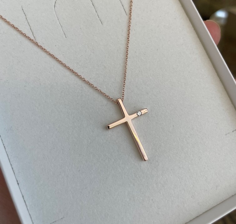 Σταυρός από ρόζ χρυσό 14κ με λευκό διαμάντι 0,03ct. Κατόπιν παραγγελίας. Διατίθεται και σε κίτρινο χρυσό η λευκόχρυσο κατόπιν παραγγελίας. Η αλυσίδα στο ίδιο χρώμα έχει έξτρα κόστος ανάλογα με το μήκος 120-180€.