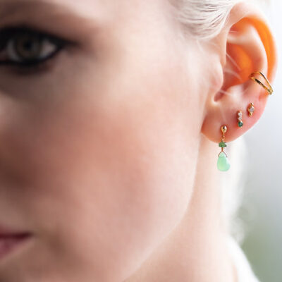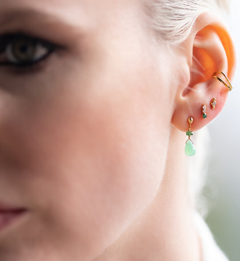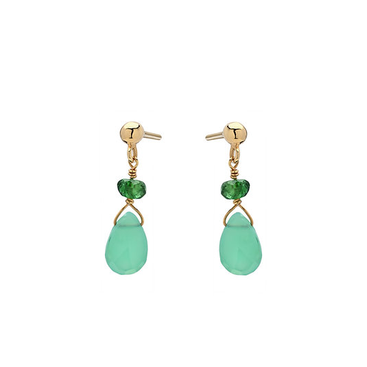 Σκουλαρίκια από 14κ χρυσό με σταγόνες χρυσοπράσιου και τσαβορίτες. Μήκος 2,5εκ.