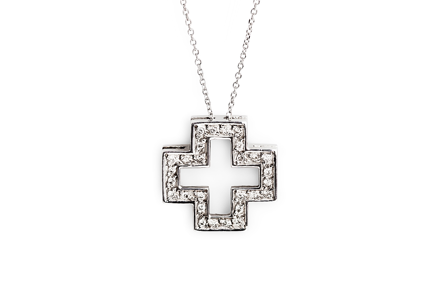 Λευκόχρυσός σταυρός 18 καρατίων με διαμάντια κοπής μπριγιάν από τη συλλογή “Eleni Marneri Curated”.
