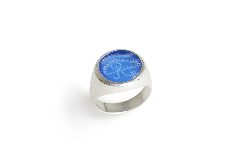 Ασημένιο δαχτυλίδι με εγχάρακτη πέτρα μπλέ αχάτη σφραγιδόλιθος με θέμα το Μάτι του Ωρου. Φοριέται και σαν σεβαλιέ.