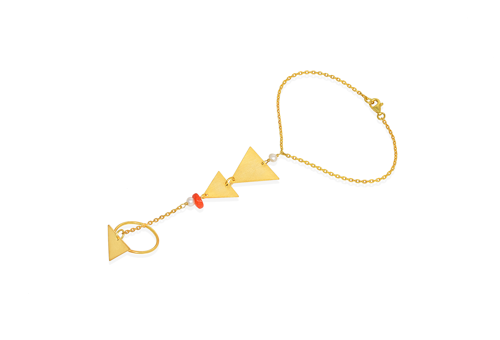 Ασημένιο επιχρυσωμένο βραχιόλι-δαχτυλίδι με μαργαριτάρι και κοράλι. Designer : Mystis by Sofia Zarari