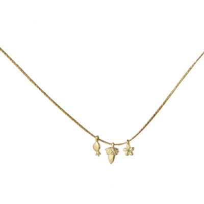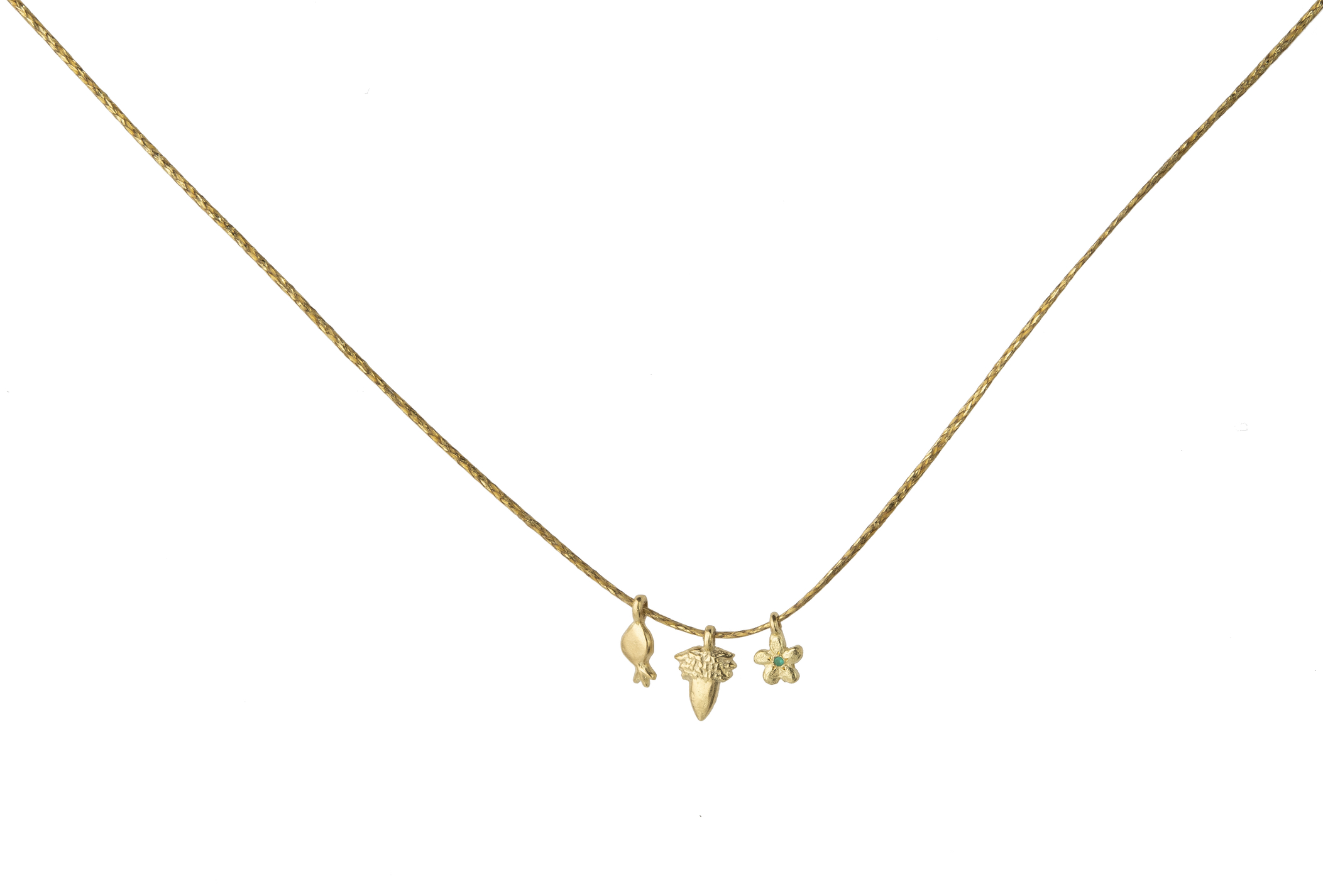 Gold 18k 3 charm pendant, flower with tsavorite, acorn and pomegranate from the Symbols collection by Joanna Peters.