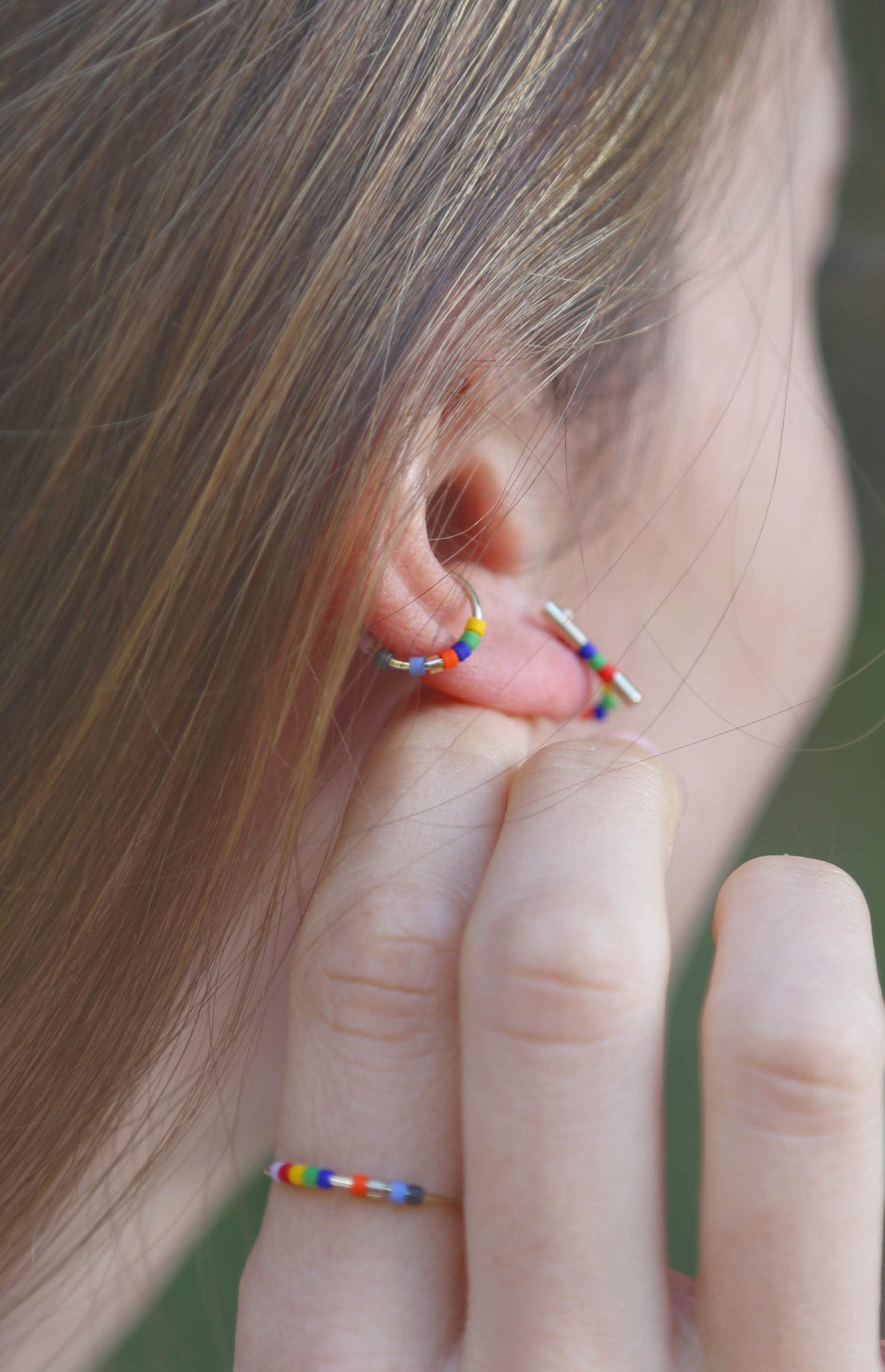 Χρυσό 14k μονό κρικάκι και πολύχρωμες γυάλινες χάντρες από τη συλλογή Happily. Για τρυπημένα ή μη τρυπημένα αυτιά.