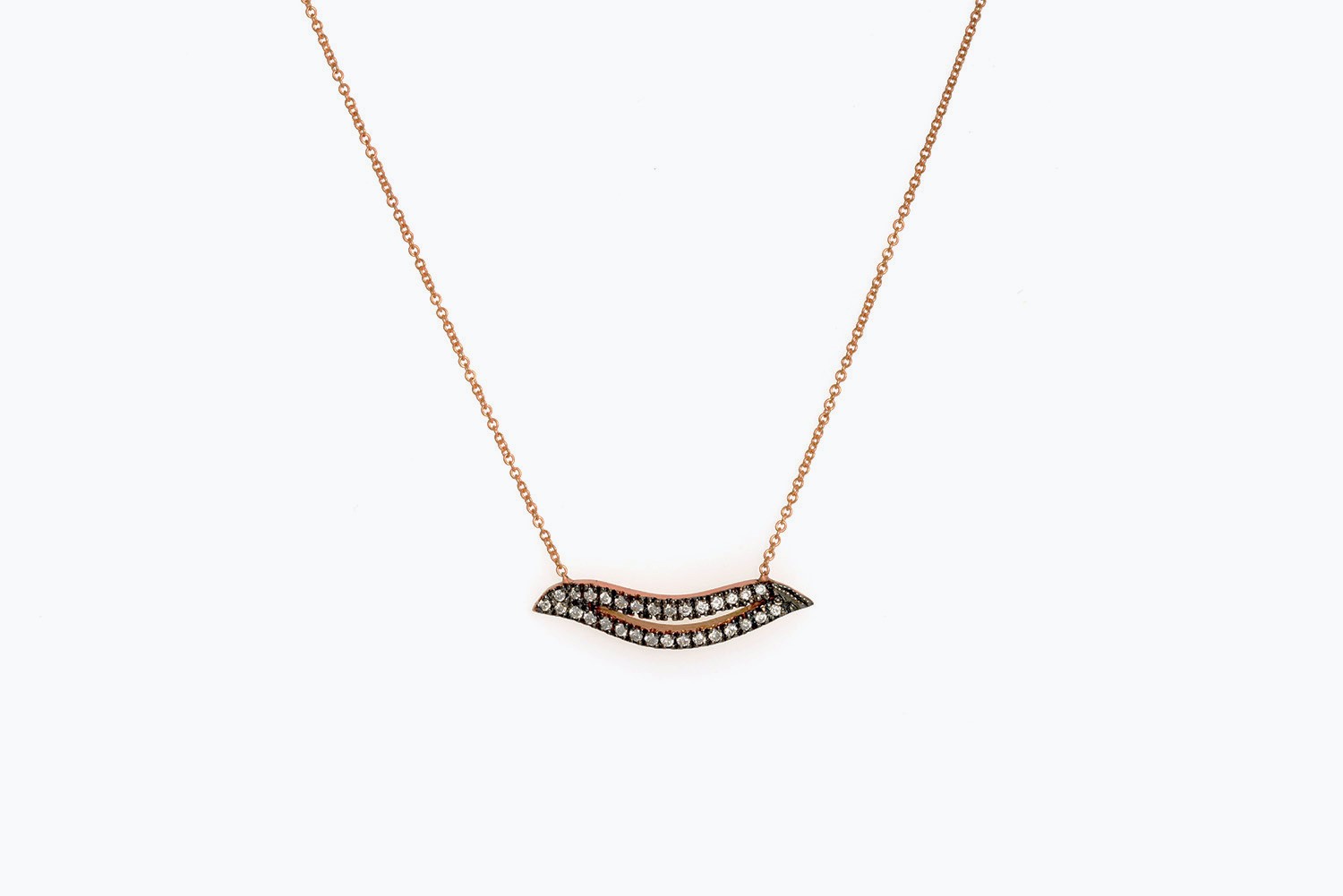 Κολιέ φύλλο από ροζ χρυσό 18 καρατίων με 27 διαμάντια brilliant-cut σε ροζ χρυσή αλυσίδα 40 εκ. Μήκος φύλλου: 2,5 cm. Μοναδικό κομμάτι.