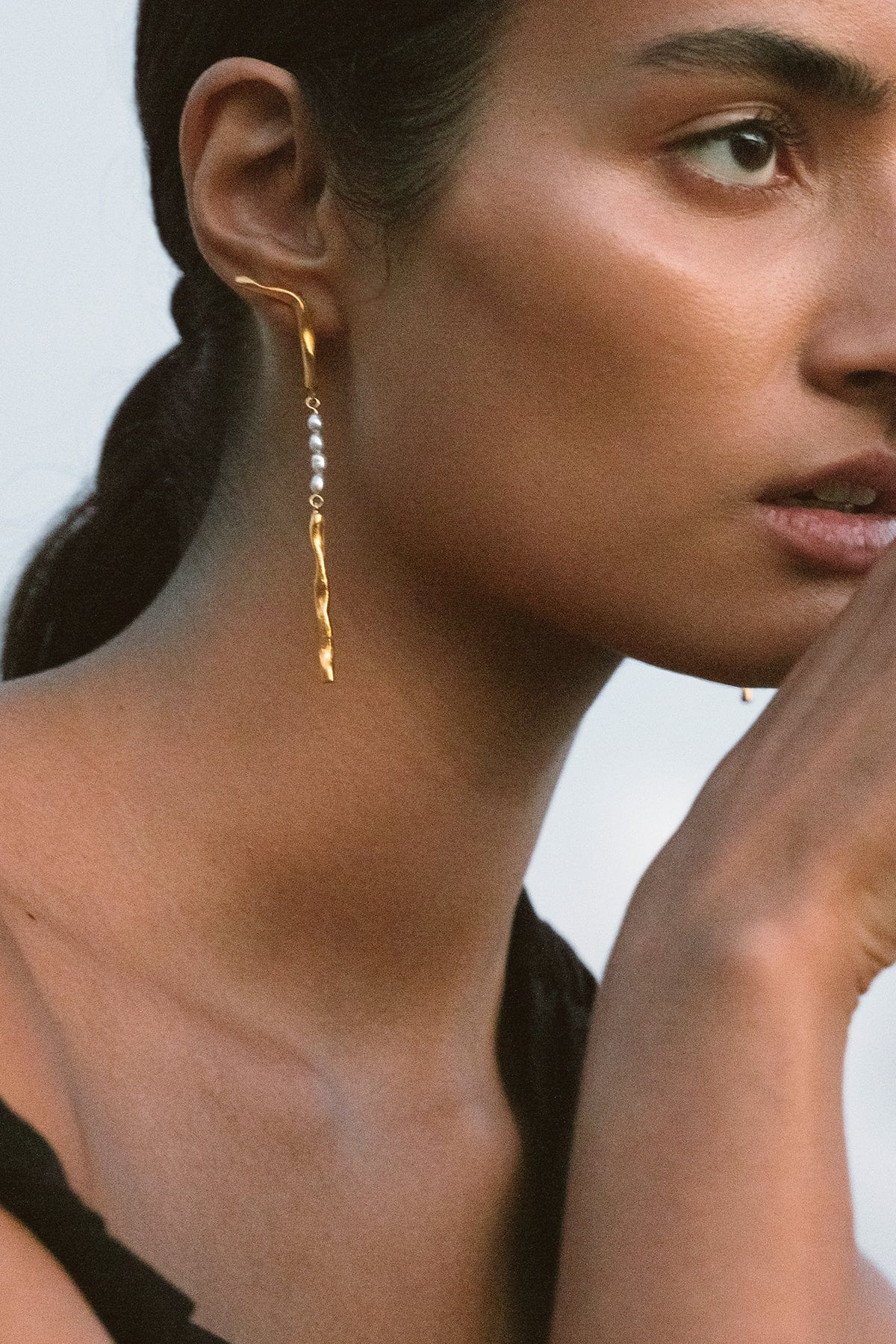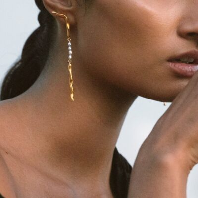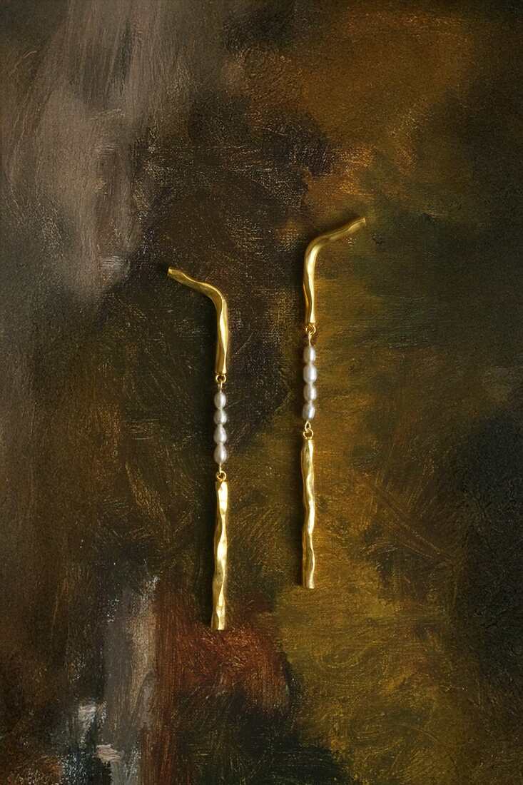 Ασημένια 18κ Επιχρυσωμένα μακριά σκουλαρίκια με μαργαριτάρια γλυκού νερού. Αυτά τα κομψά σκουλαρίκια έχουν πολύ ωραία κίνηση και προσθέτουν μια εορταστική νότα σε κάθε ντύσιμο. Διαστάσεις: μήκος 8 cm.