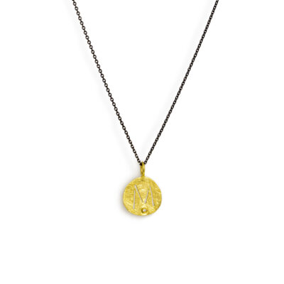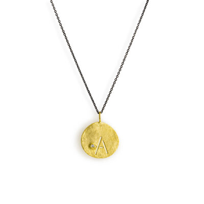 Δίσκος μονογράμματος “A” μεσαίου μεγέθους από χρυσό 14Κ με διαμάντι σε οξειδωμένη ασημένια αλυσίδα. Διαφορετικά γράμματα είναι διαθέσιμα στο φυσικό και στο ηλεκτρονικό κατάστημα αλλά και κατόπιν αιτήματος. Διατίθενται διαφορετικά μήκη αλυσίδας κατόπιν αιτήματος.