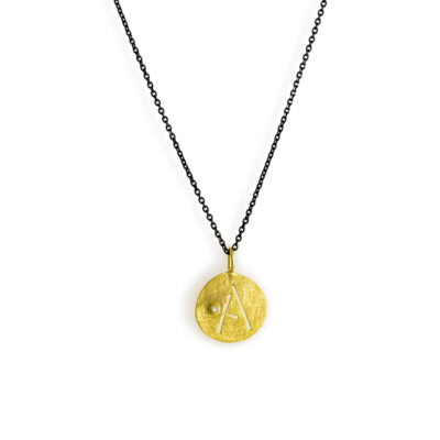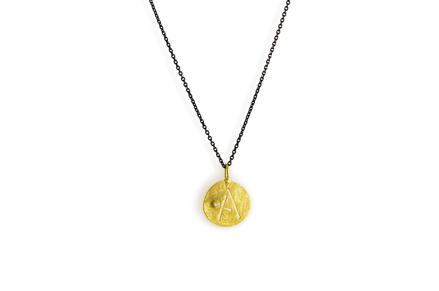 Δίσκος με μονόγραμμα μικρού μεγέθους “A” από χρυσό 14Κ με διαμάντι σε ασημένια οξειδωμένη αλυσίδα. Διαφορετικά γράμματα είναι διαθέσιμα στο φυσικό και στο ηλεκτρονικό κατάστημα αλλά και κατόπιν αιτήματος. Διατίθενται διαφορετικά μήκη αλυσίδας κατόπιν αιτήματος.