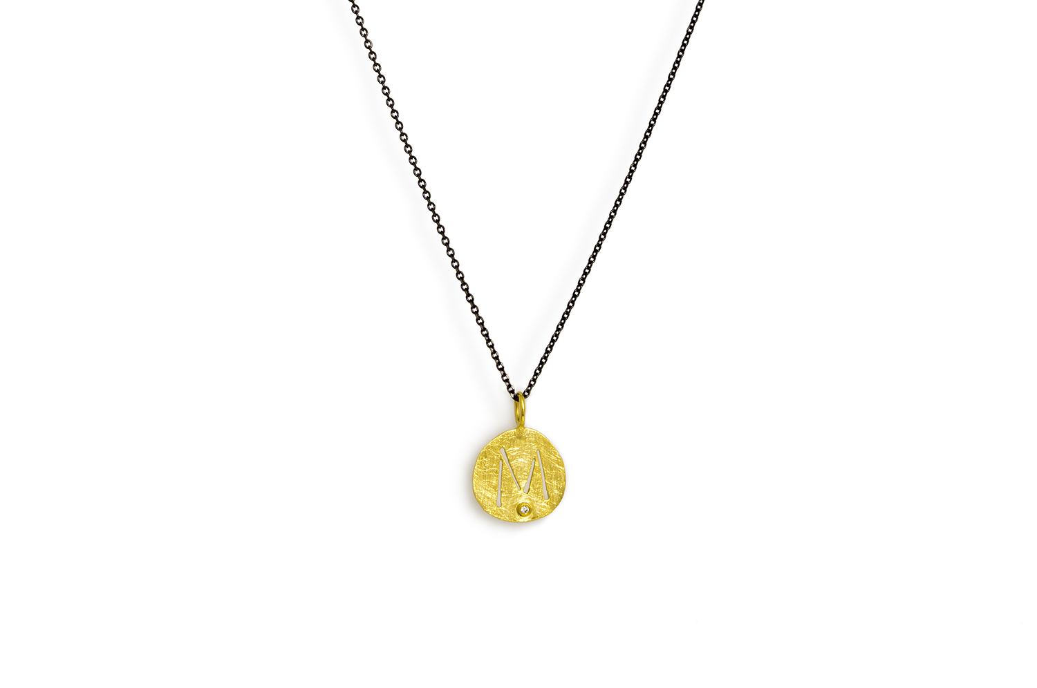 Δίσκος μονόγραμμα μικρού μεγέθους “Μ” από χρυσό 14Κ με διαμάντι σε ασημένια οξειδωμένη αλυσίδα. Διαφορετικά γράμματα είναι διαθέσιμα στο φυσικό και στο ηλεκτρονικό κατάστημα αλλά και κατόπιν αιτήματος. Διατίθενται διαφορετικά μήκη αλυσίδας κατόπιν αιτήματος.