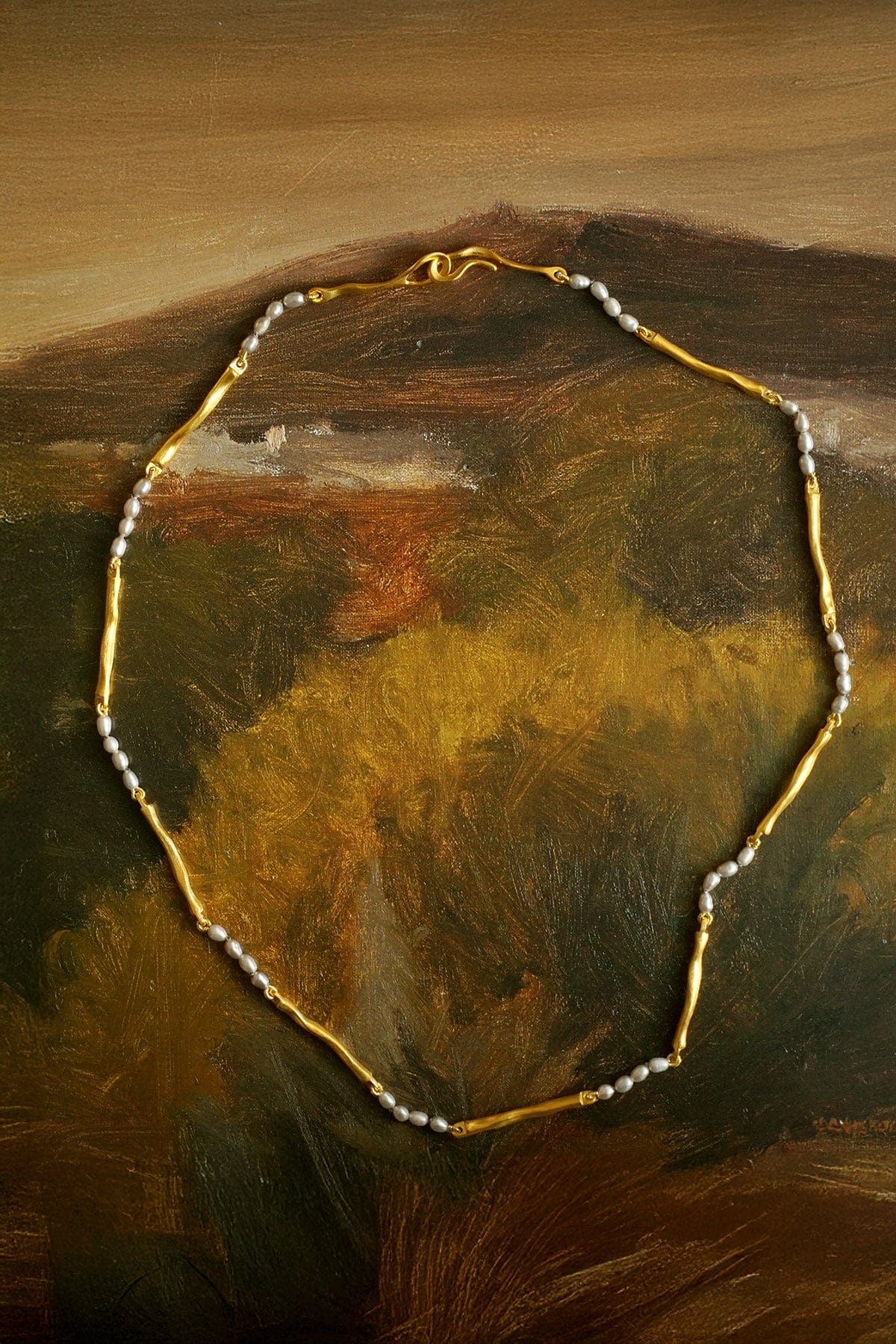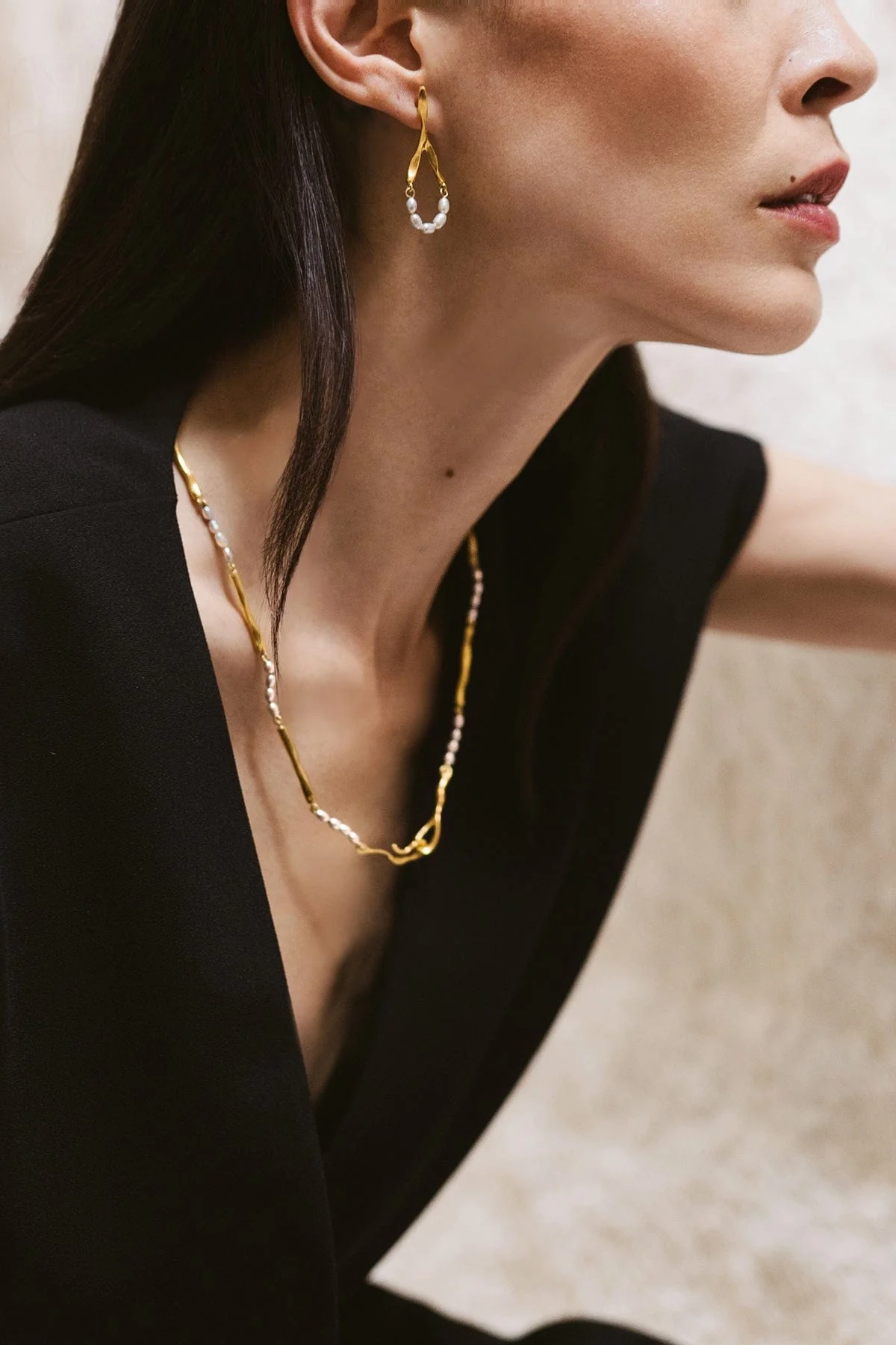 Το κολιέ Oriana Stria συνδυάζει τα μαργαριτάρια με τις καθαρές γεωμετρίες, φινιρισμένες με οργανικές καμπύλες. 18k επιχρυσωμένο ασήμι & μαργαριτάρια γλυκού νερού. Μήκος 54 εκ.
