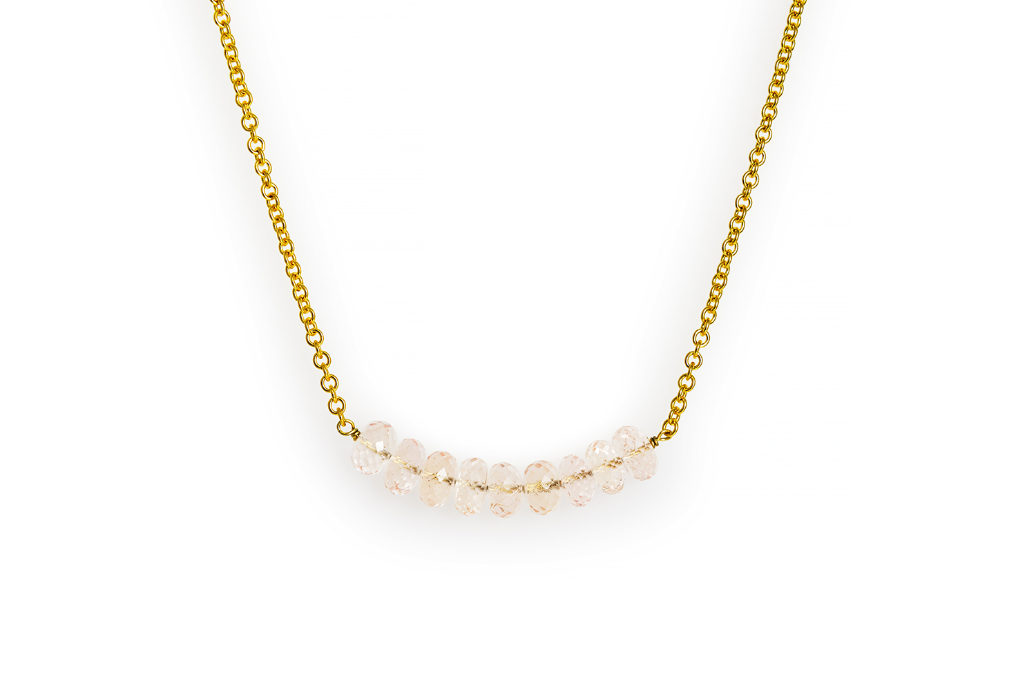 Κολιέ με πέτρες μοργκανίτη εκλεκτής κοπής σε αλυσίδα 14k. Πρόκειται για ένα αποκλειστικό αντικείμενο που σχεδιάστηκε και παρήχθη από την γκαλερί Ελένη Μανέρη.