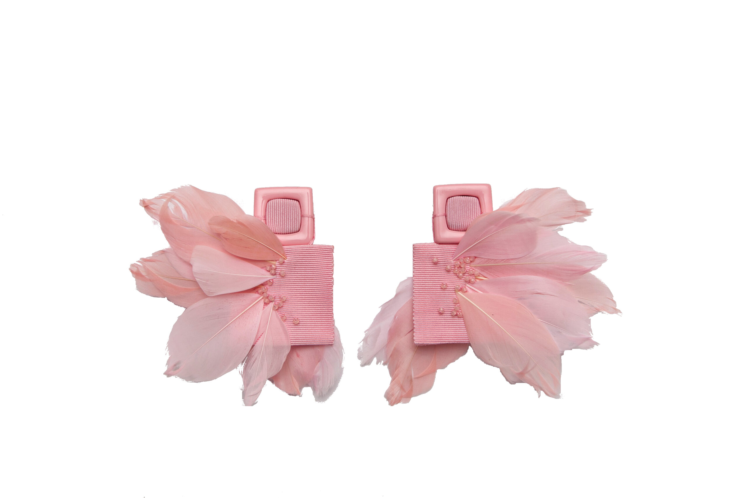 Σκουλαρίκια από γκρο κορδέλα, κεντημένα με φτερά χήνας και χάντρες. Δε χρειάζονται τρυπημένα αυτιά.