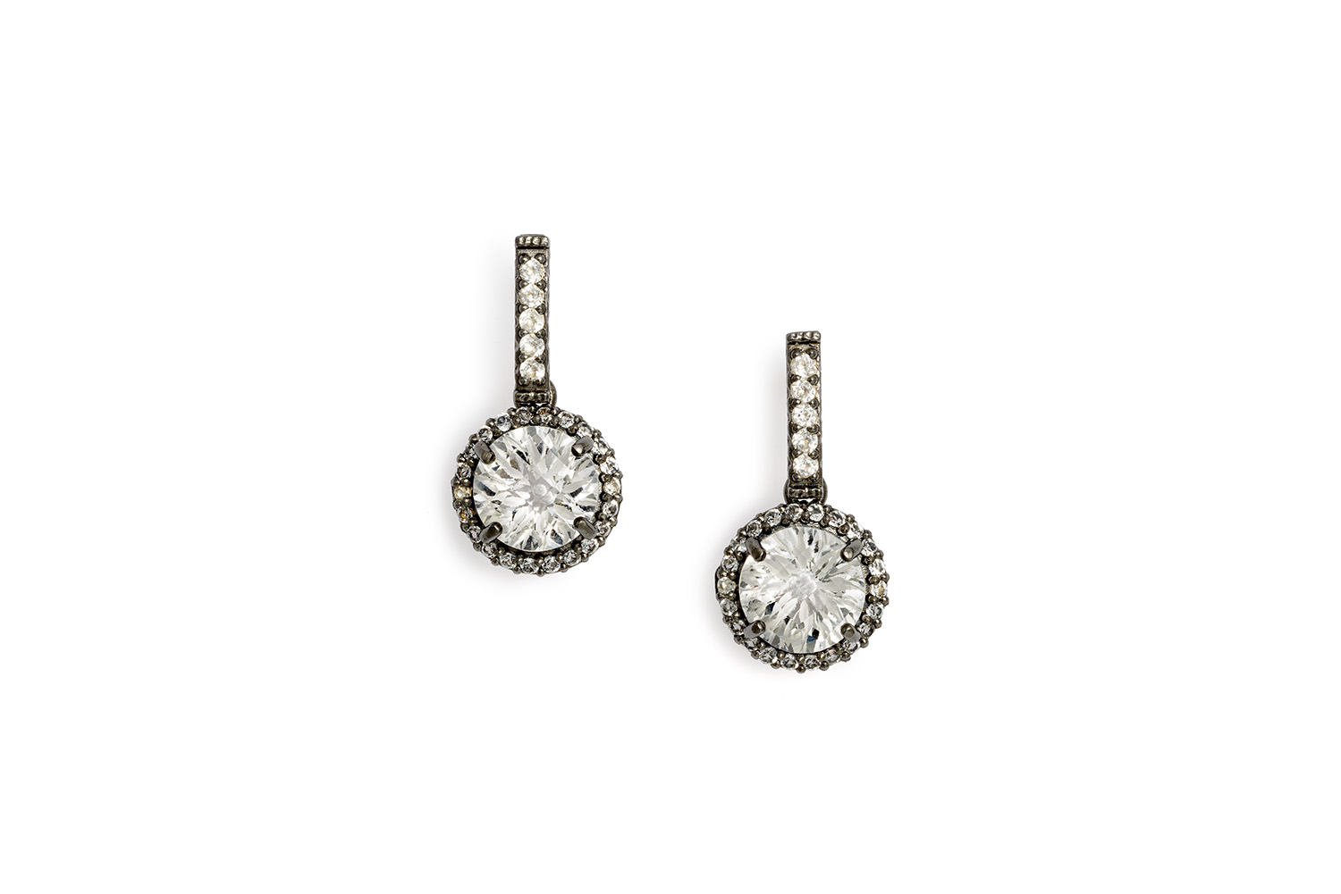 Ασημένια 925, οξειδωμένα σκουλαρίκια με quartz πέτρες οι οποίες έχουν χειροποίητη χάραξη από πίσω για μεγαλύτερη λάμψη, περιτριγυρισμένα με λευκά τοπάζια. Μήκος σκουλαρικιού : 2,5cm, Ροζέτα : 1,5cm