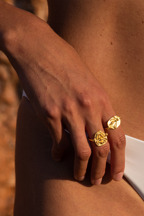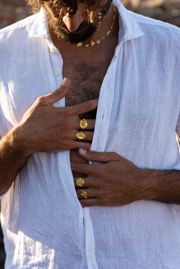 Η “Shales” είναι μια hybrid capsule συλλογή, εμπνευσμένη από το καλοκαίρι που πέρασε στις Κυκλάδες. O σκαραβαίος – ειδικά το πράσινο είδος – είναι γνωστός για τη μακροζωία και την αναγέννηση, που έρχεται από τη Μέση Ανατολή για να επηρεάσει τους Έλληνες με τους πιο περίεργους τρόπους, όπως οι φυγόκεντρες παρατηρήσεις. Λατρευόταν επίσης ως ζωντανό κόσμημα, αφού χρησιμοποιήθηκε από χαράκτες πολύτιμων λίθων ως μελέτη μορφών. Σμιλεύτηκαν επίσης πέτρες σε σχήμα σκαραβαίων για να δοθούν σε έγκυες γυναίκες για να διατηρηθούν ασφαλείς. Δαχτυλίδι χειροποίητo με λεπτομέρεια, με σκοπό να μιμηθεί τα απολιθώματα που έχουν απομείνει αποτυπωμένα σε σχιστόλιθους, που σώζονται ακόμη στο χρόνο.