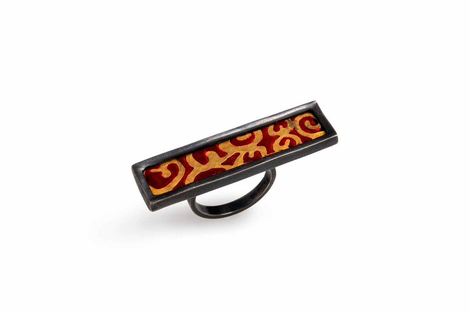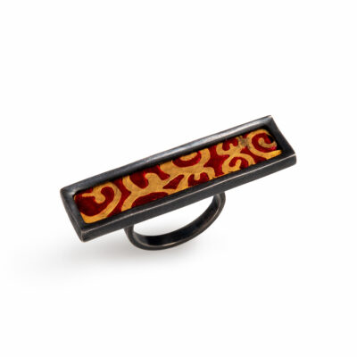Ασημένιο οξειδωμένο ορθογώνιο δαχτυλίδι με στοιχεία χρυσού 18 καρατίων και βελούδινο ύφασμα στο φόντο.