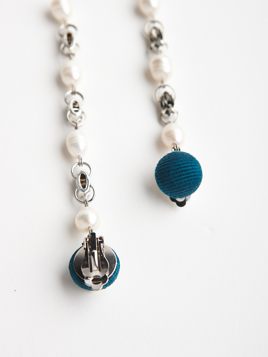 Σκουλαρίκια που αποτελούνται από ένα κουμπί καλυμμένο με γκρο κορδέλα και μια αλυσίδα από μαργαριτάρια γλυκού νερού και γκρίζους κρυστάλλους swarovski.