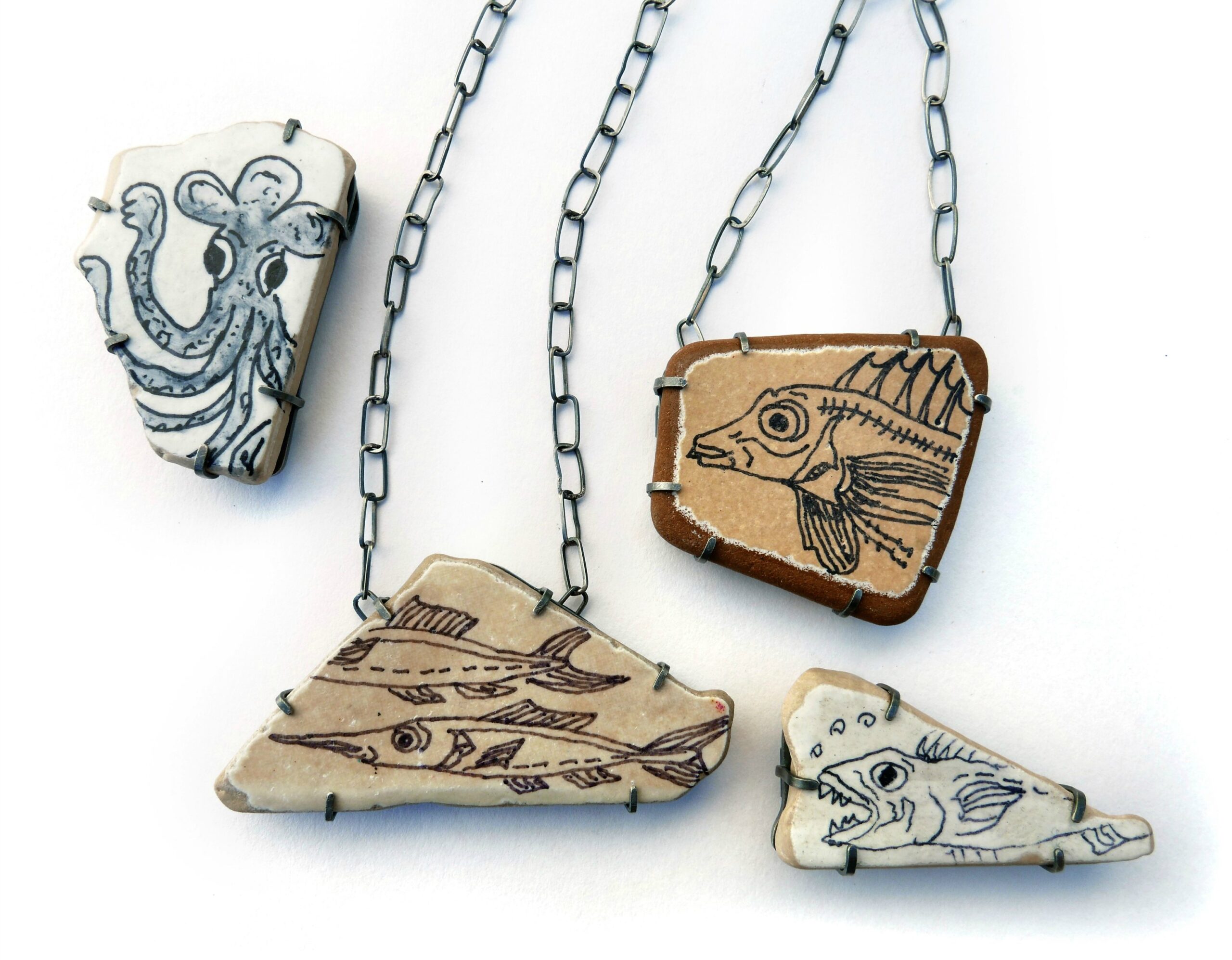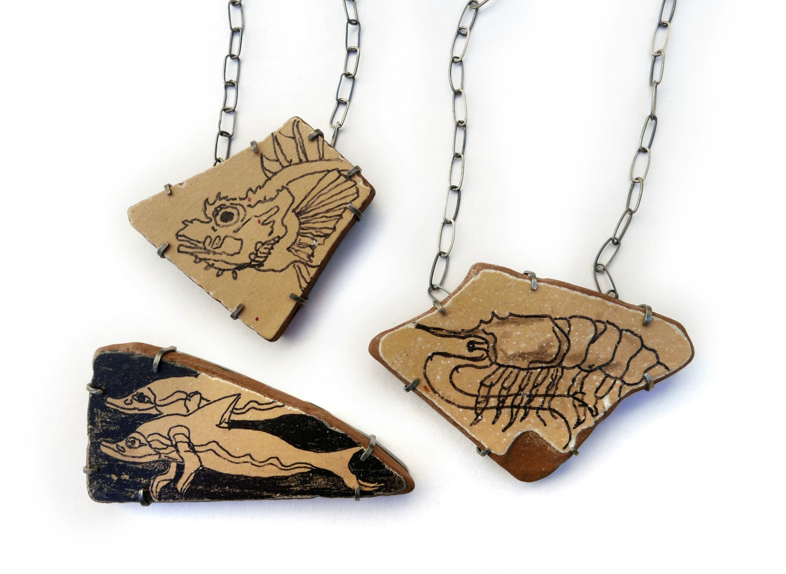 For Danae Natsis, Lou’s works continue the marine themes in her work, as well as her interest in ancient artifacts and treasures from under the sea. She transforms these artworks into personal adornments according to the tradition of miniature portrait jewelry. Danae is interested in the transformation of everyday material, clay, into a precious artifact – in this case, with the intervention of time and two contemporary artists, a simulacrum of an ancient fragment.