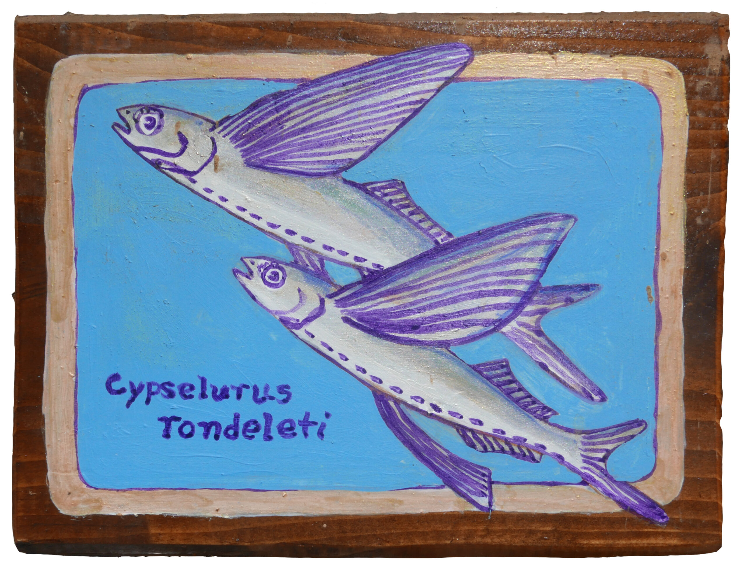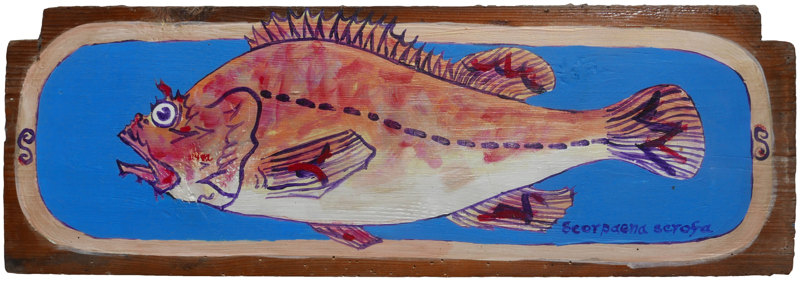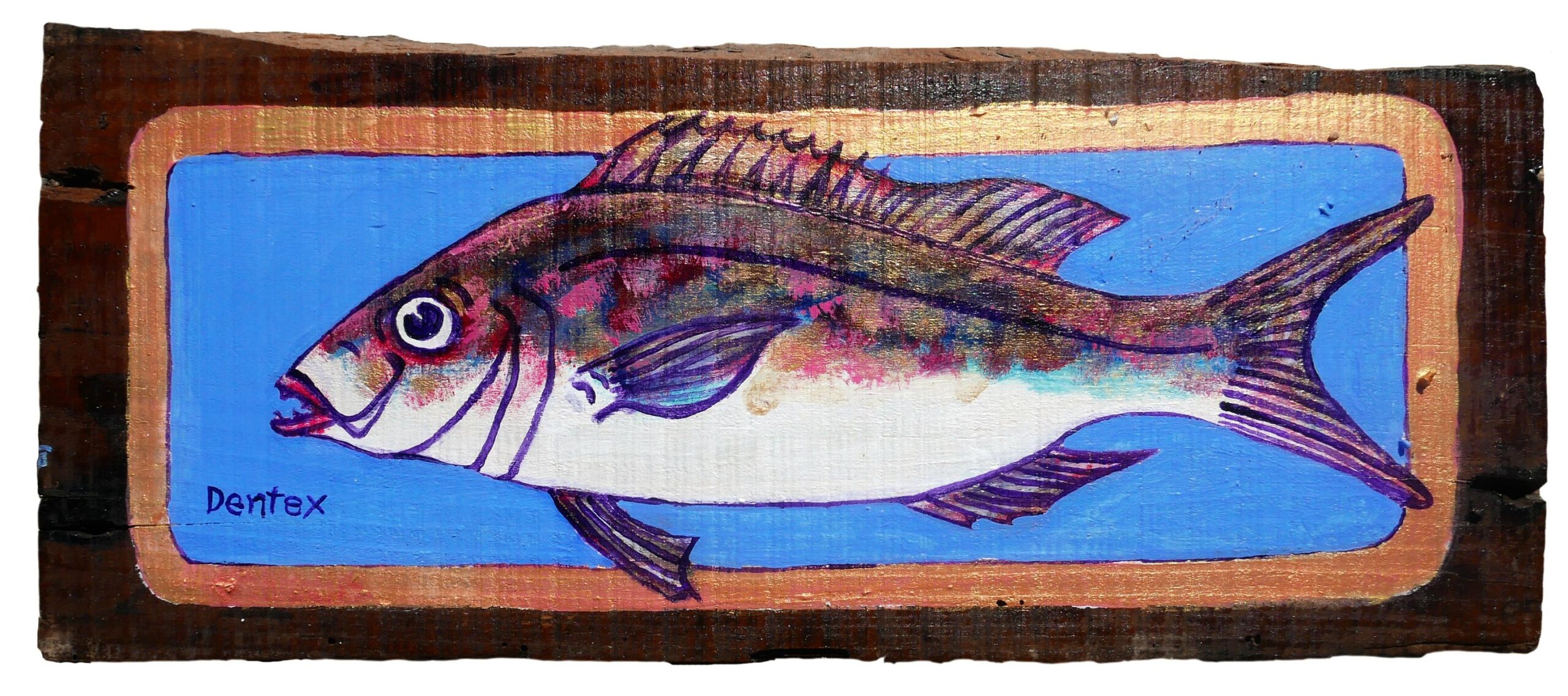 For many years Lou Efstathiou, his family, and friends, have spent time collecting sea-worn ceramic tile fragments from a beach on the island of Kea where Lou has his summer studio. Lou started drawing amusing and intimate portraits of fish of the Aegean, leisurely women, and Minoan goddesses on these tiles, as well as on found wood panels. He at first made the tile drawings as miniatures to amuse himself and friends and family with a sense of Aristophanic humor.