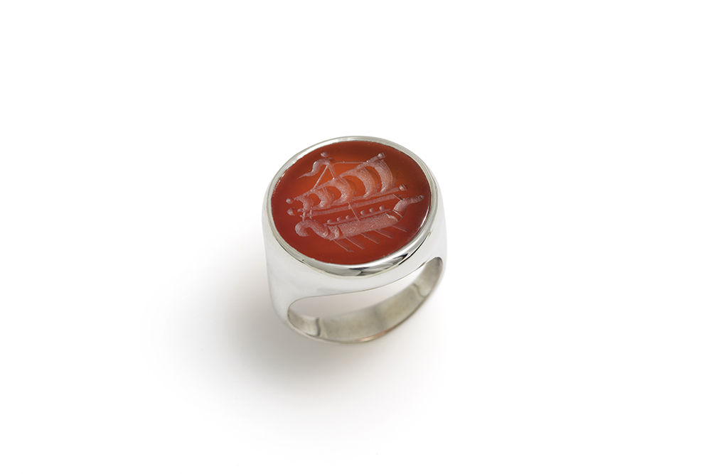 925 silver sealstone ring with cornelian engraved with the ancient greek boat trireme (τριήρης).