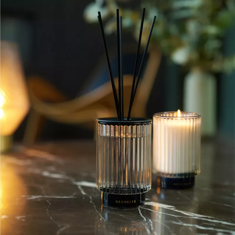 Geodesis room diffusers work by capillary action: the perfume sticks are immersed in the fragrance solution, and the fragrance diffuses naturally and autonomously.