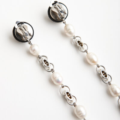 Earrings composed of a grosgrain covered button that conceals a clip on fastening. A chain of fresh water pearls and grey crystals drop off. They do not require pierced ears.