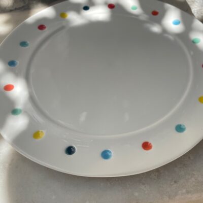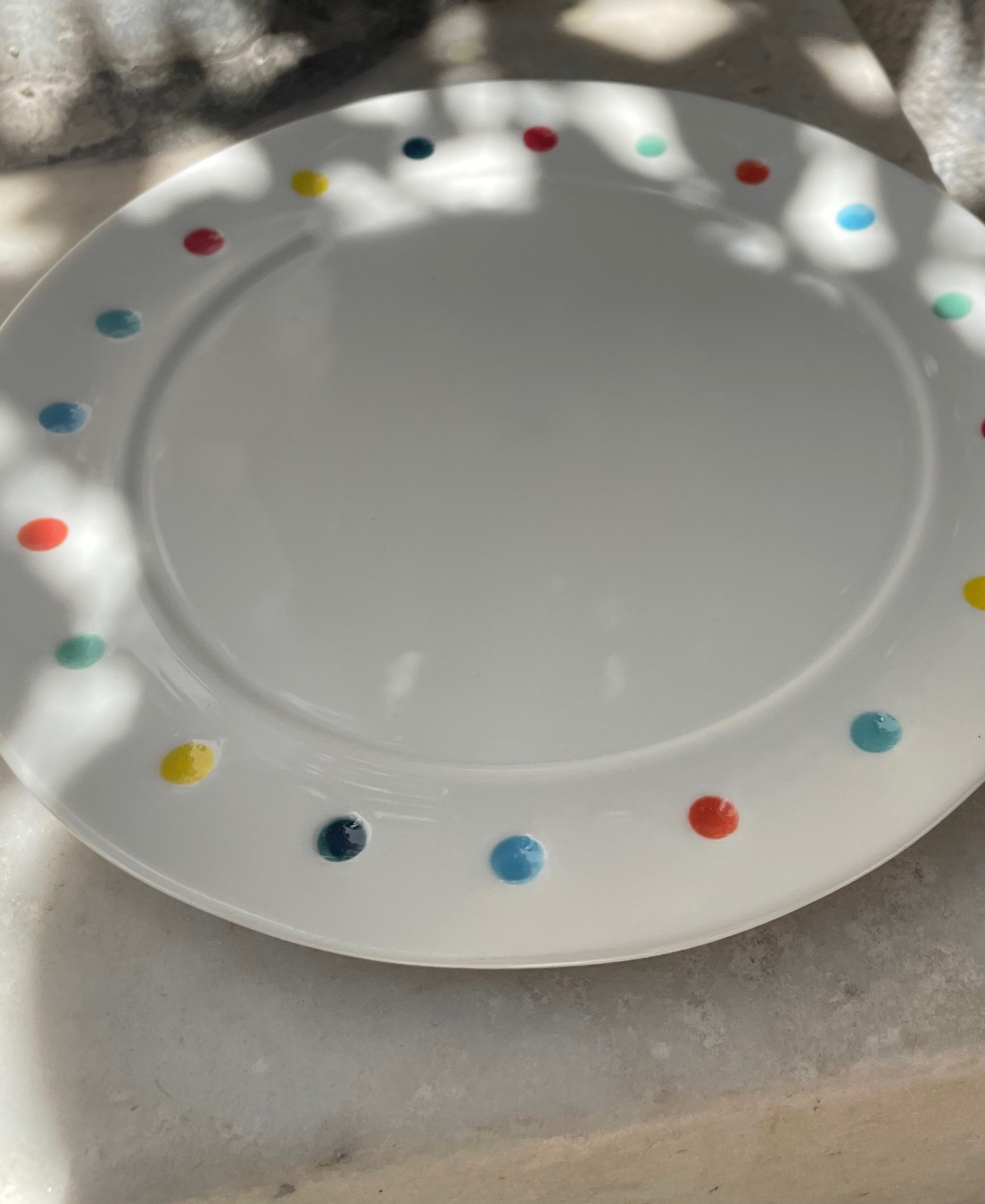 Color Dotted Plate made of white porcelain, from the collection “Intimacy in Transition” by Aris Galstyan, Dimensions: 25cm x 25cm. Suitable for all food and washable even in the dishwasher.
