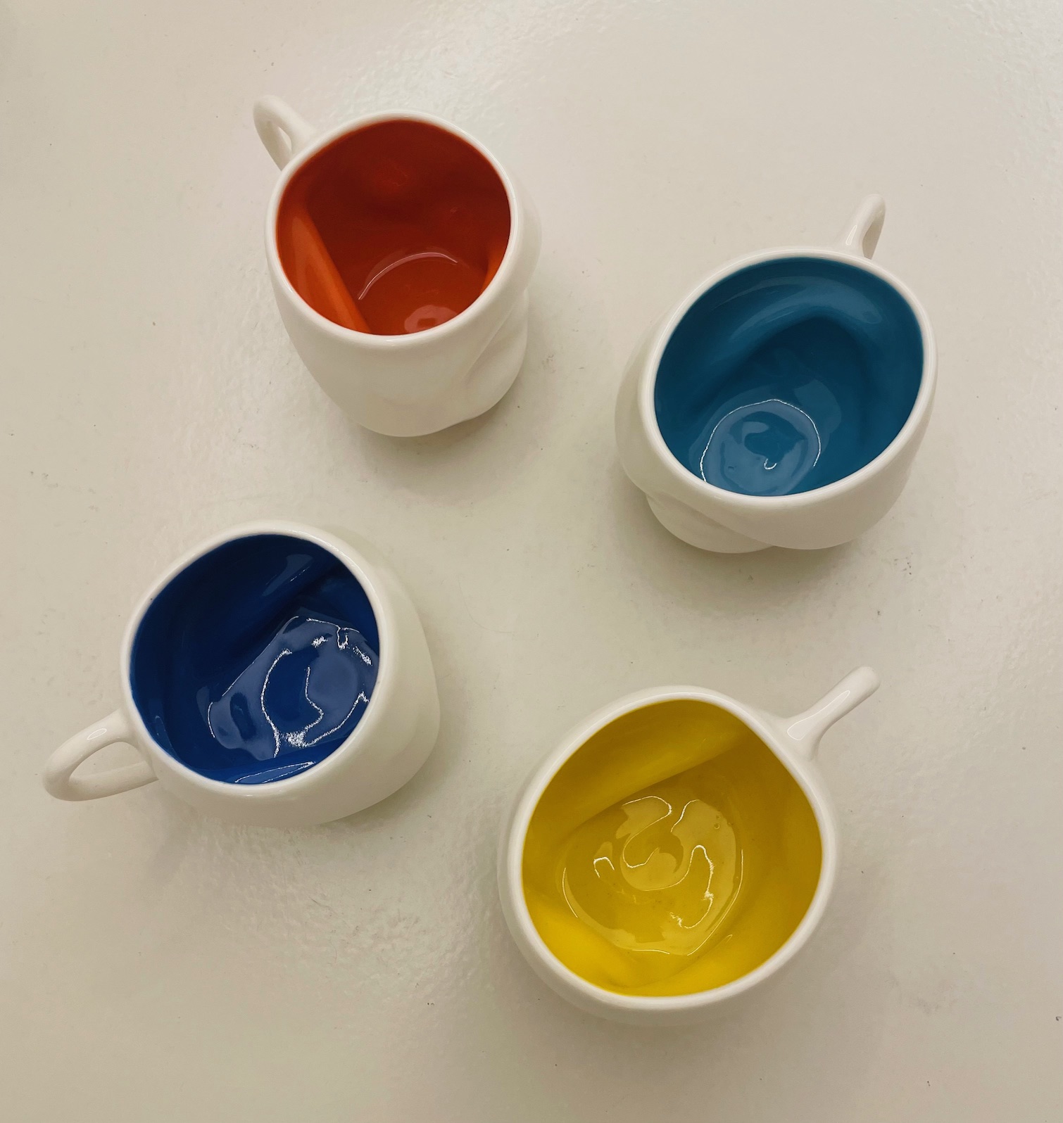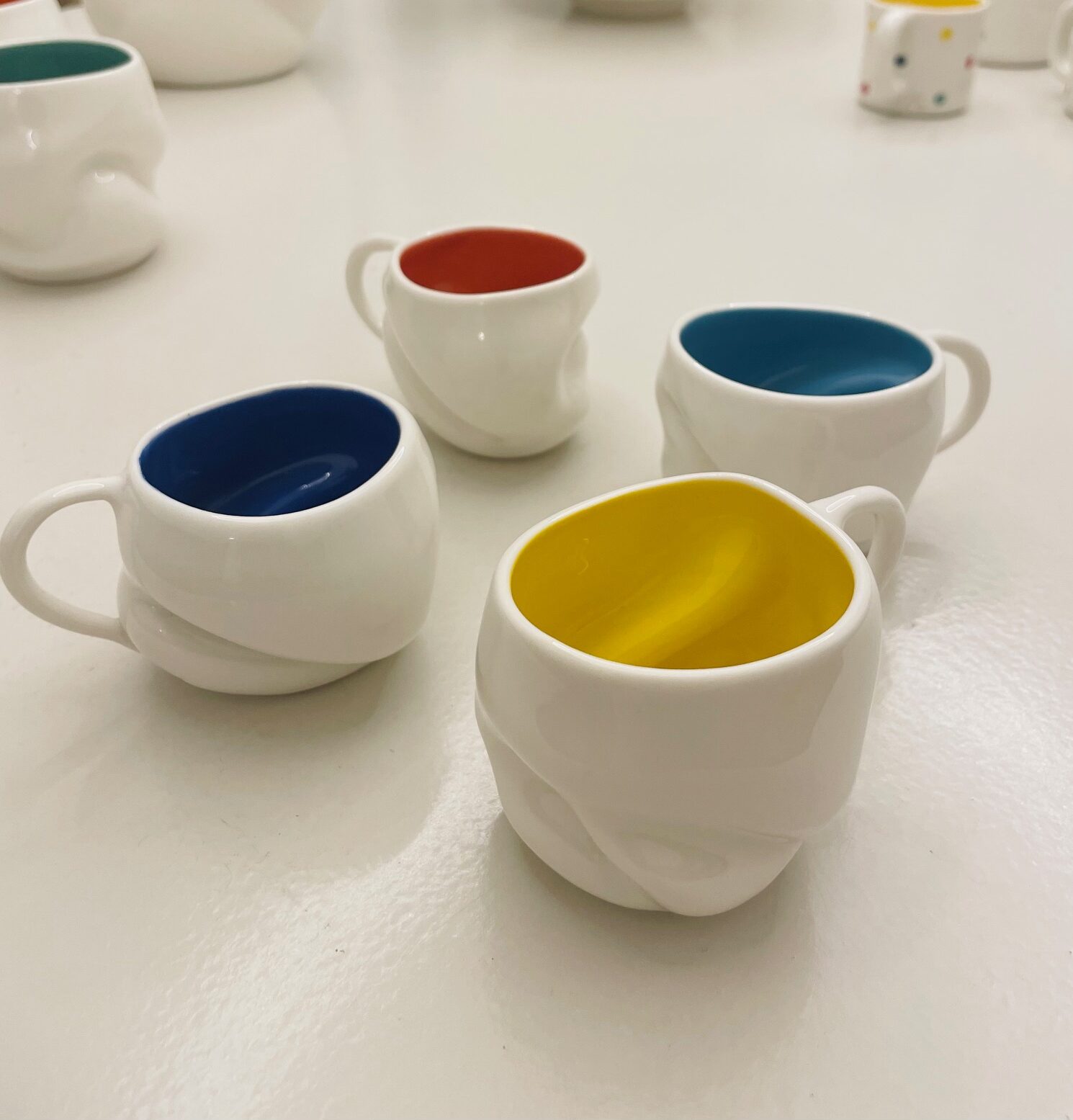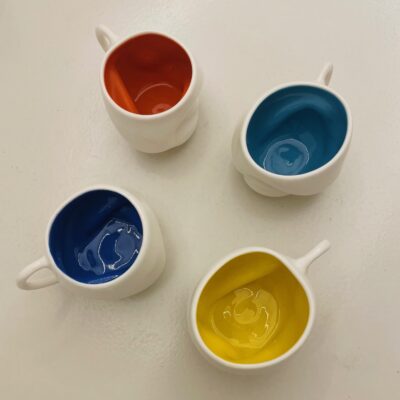 Coffee Cup/ made of white porcelain with different colors from the collection “Intimacy in Transition” by Aris Galstyan, Dimensions: 6cm x 5,5cm. Usable and washable in the dishwasher.