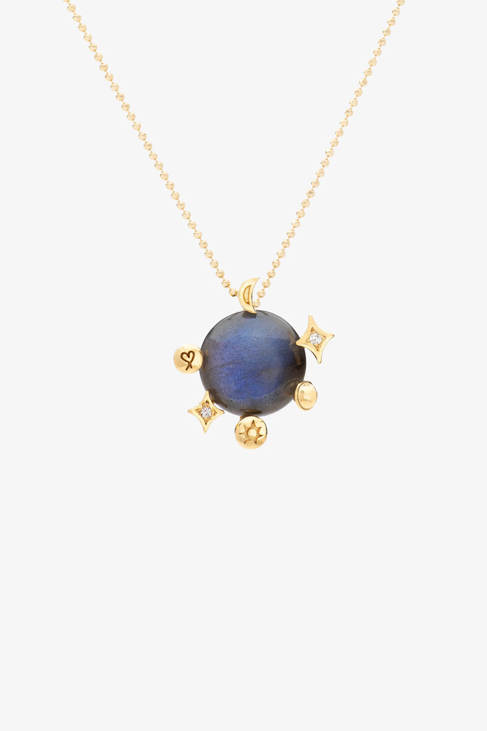 At the heart of the talisman, a luminous labradorite shines like a cosmic disco ball. Around it, celestial symbols : a heart, a moon, a planet, the sun, and distant stars, orbit in perfect harmony, as if caught in an eternal dance. The Gouri 2026 celebrates a year of sparkle, freedom, unity, and cosmic love, a reminder to move through life with light and connection. Centerpiece: a luminous labradorite cabochon. Each labradorite stone features unique color variations, ranging from subtle green and blue tones to warm brown hues.