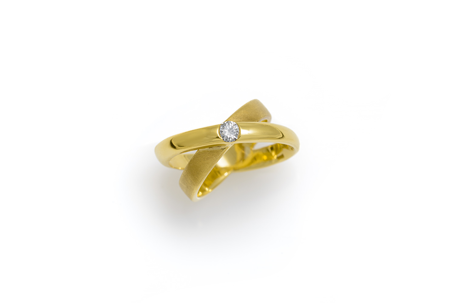 Crossing Bands Gold ring with a White Diamond 0,25ct. Size: 54. Vintage, one of a kind from our Curated Collection.