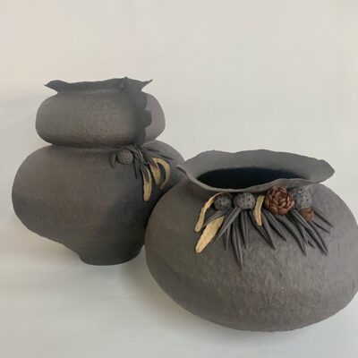 Organic forms, curves with earthy tones decorated with handmade realistic ceramic flowers, made with the coil technique, one of the oldest ancienmt ceramic techniques.