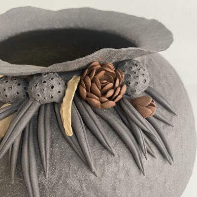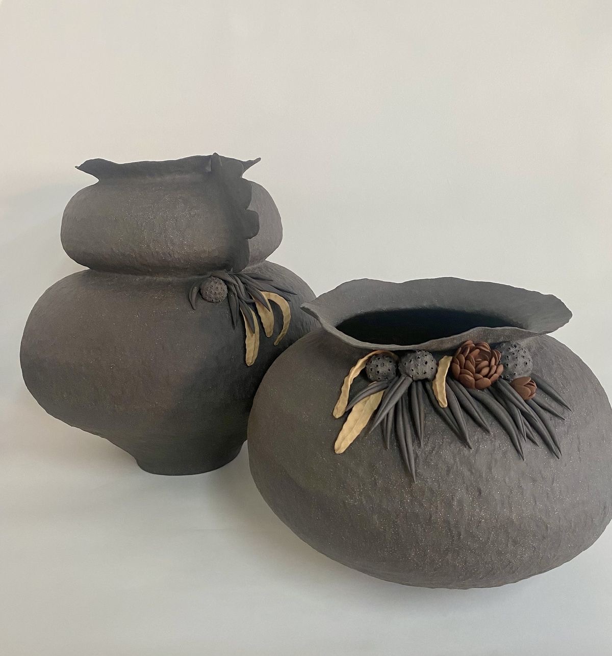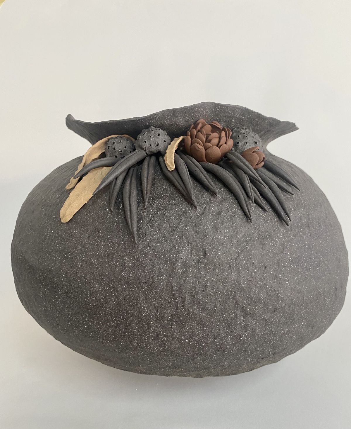 Organic forms, curves with earthy tones decorated with handmade realistic ceramic flowers, made with the coil technique, one of the oldest ancienmt ceramic techniques.