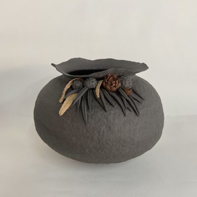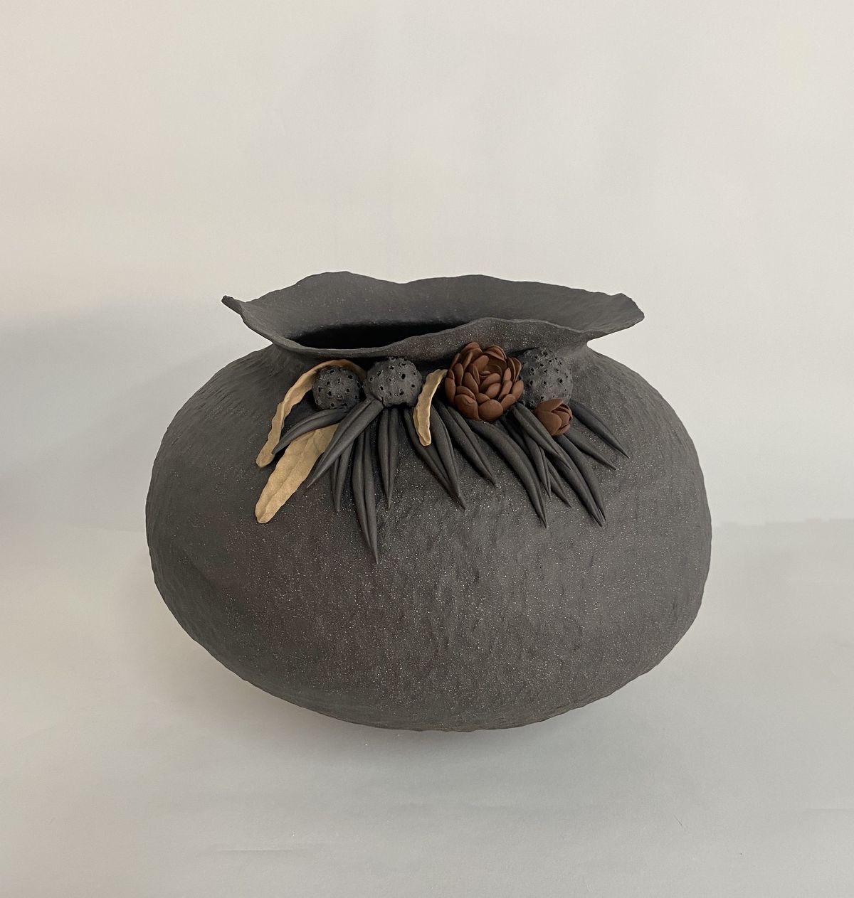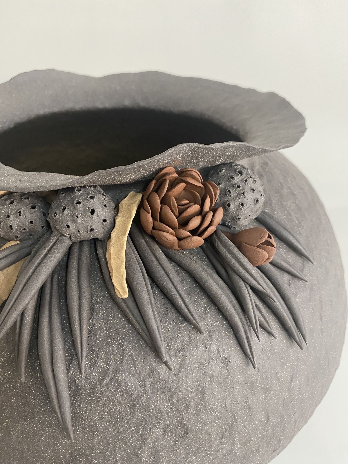 Ceramic vessel made of grey stoneware clay, decorated with handmade realistic flowers and glazed inside and fired at 1200 °C. Terrestrial Curves ceramic collection by Nancy Leivathinou. Dimensions : 38cm width, 28cm height.