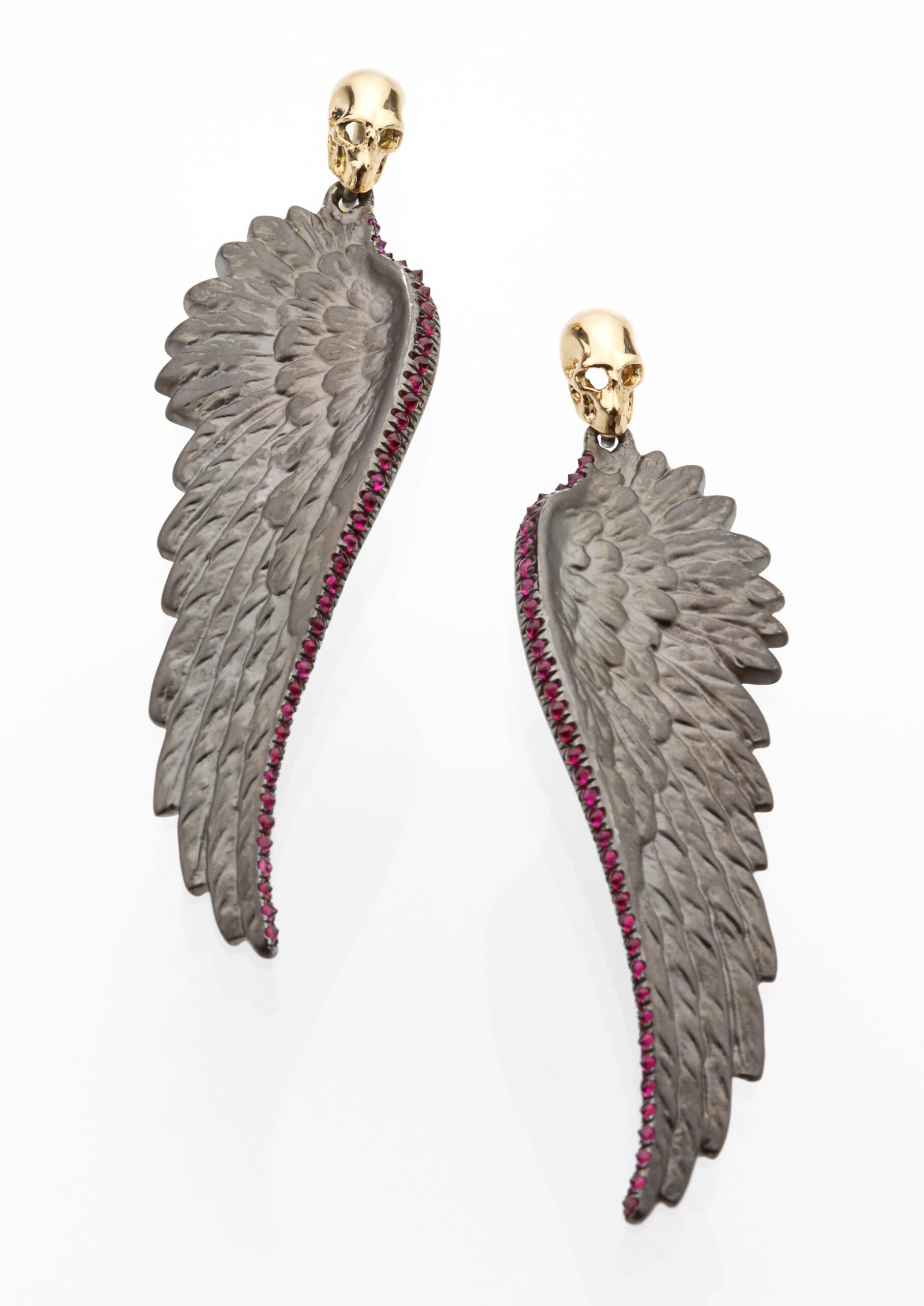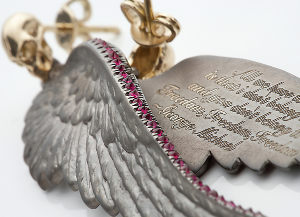 One-off pair of silver earrings with a different engraved inscription on each one, adorn with one line of rubies on the edge of every earring, and two 18kt gold skulls with a brilliant-cut diamond in the center.