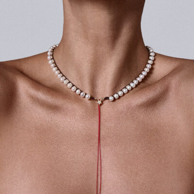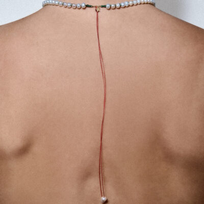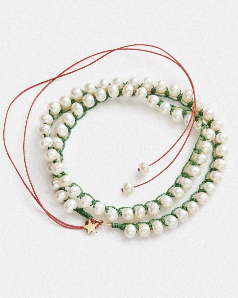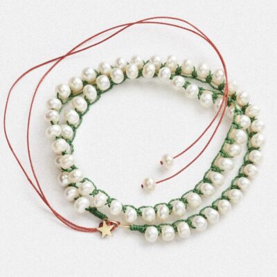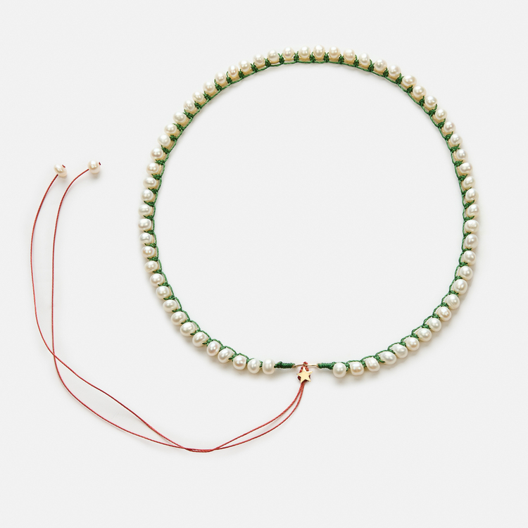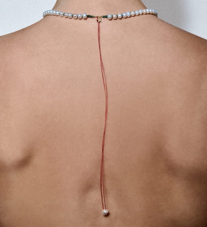 Evolution, healing, and self-renewal. A symbol of becoming. Wear it solo for a statement of freshness, or combine it with neutral tones. The green adds a balancing, calming presence, while the embroidered details bring texture and intention to the piece. The star at the back gives a delicate finishing touch on summer dresses. Handcrafted in 925 sterling silver, it offers a blend of purity and quiet resilience. Its adjustable length allows you to adapt the fit, creating space for flow, movement, and expression. Fresh water pearls 5.5-6mm, goldplated silver star, adjustable length.