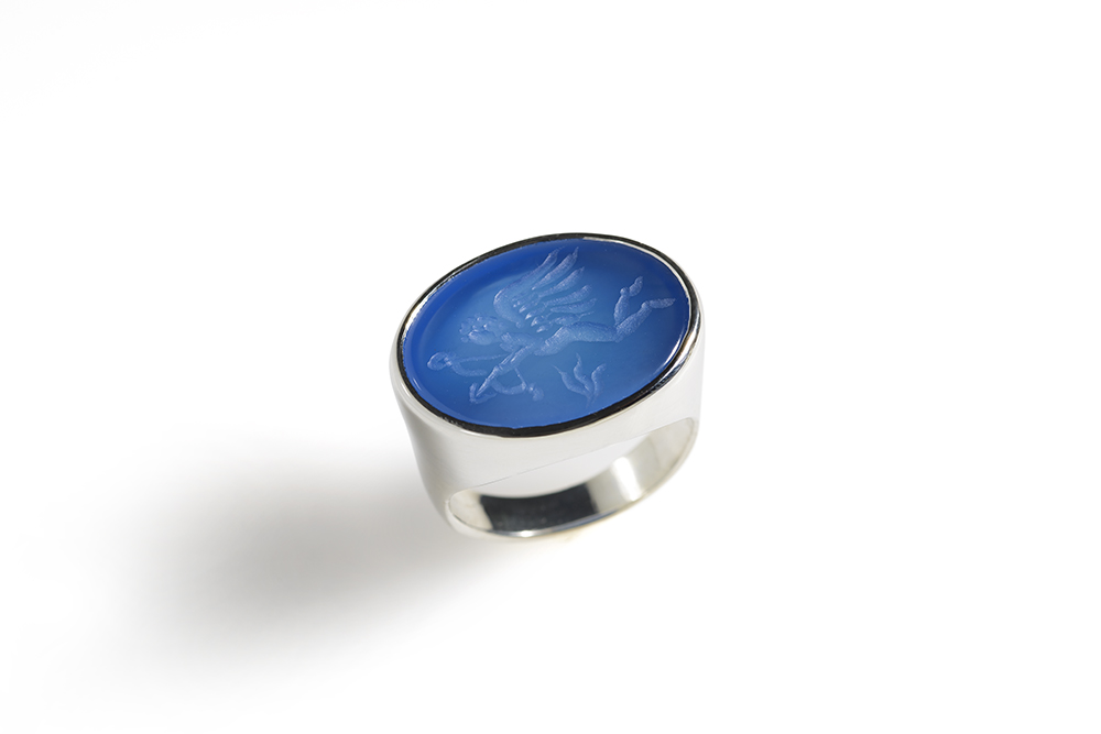 925 silver sealstone ring with blue agate engraved with Eros motif.