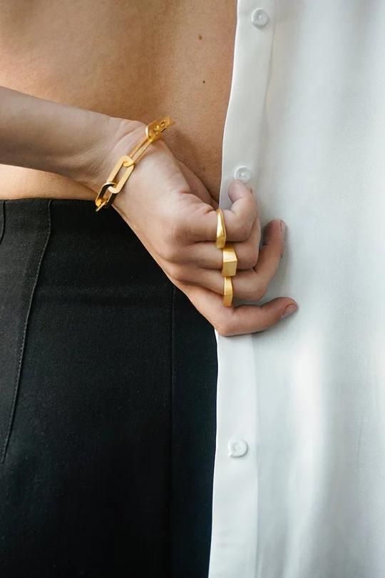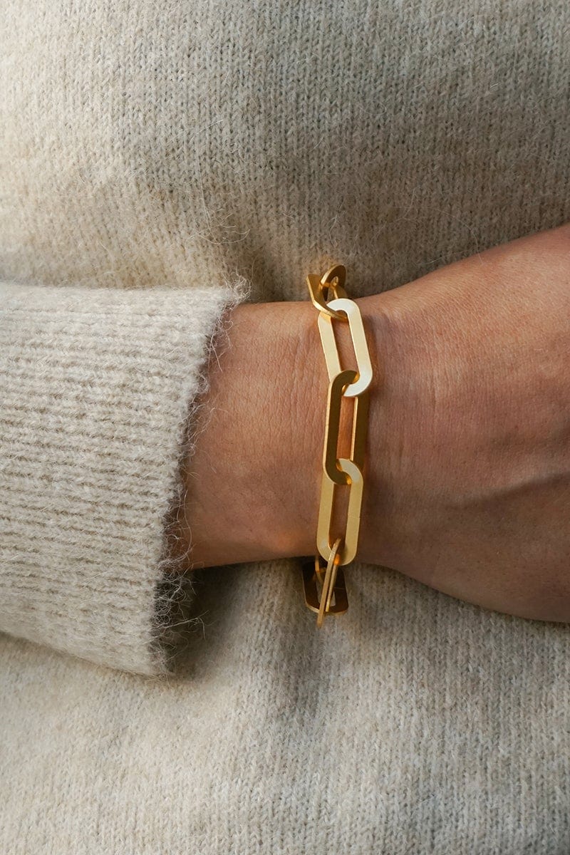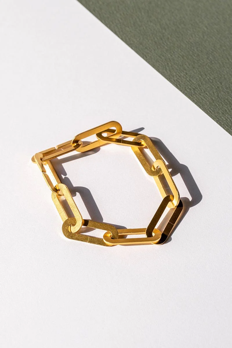 A chunky link bracelet made from flat interlocking ovals that are connected by hand one by one, with a clever “seamless” lock that integrates invisibly to the design. 18k silver goldplated.