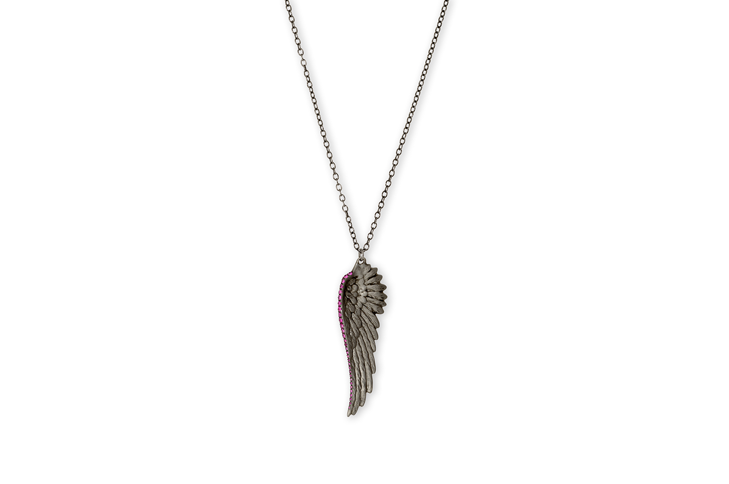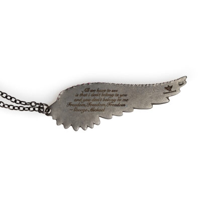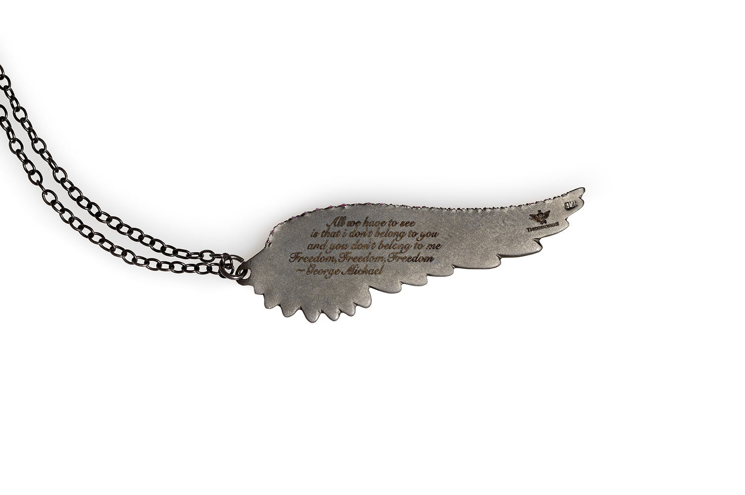 Black wing pendant made of silver black plated with rubies and black plated chain 50 cm. Inscribed on the back with the lyrics of the song “Freedom” by George Michael.