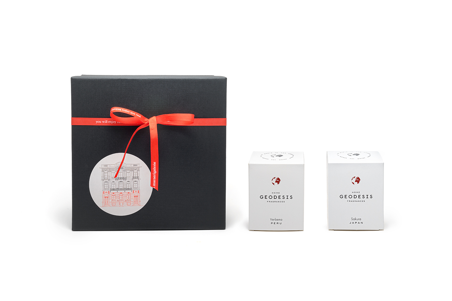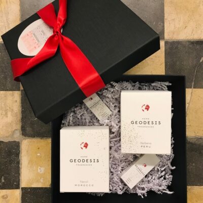 A gift box containing two scented candles of your choice by Geodesis Parfums inside a hard, square, black box of fine paper.